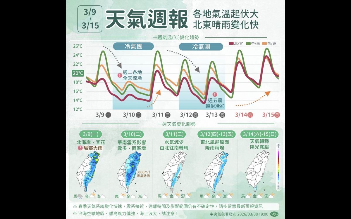 (記者許皓庭/綜合報導)中央氣象署今(9)日警示,未來一週將迎來兩波強烈冷空氣接力南下,強度可達大陸冷氣團至強烈大陸冷氣團等級。首波冷空氣今日起影響台灣,配合華南雲雨區東移,全台天氣轉為濕冷,北部及東北部低溫將下探 12 至 14 度,基隆北海岸及大台北山區需留意較大雨勢。氣象署預估,週三短暫回溫後,週四將有第二波冷氣團南下,民眾務必留意溫差變化。