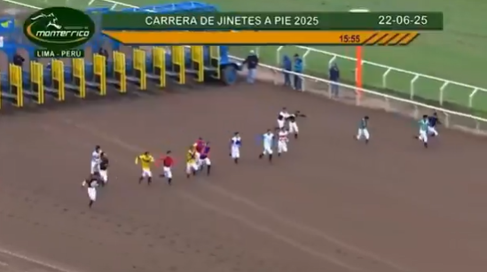 這場名為「騎師徒步賽」(CARRERA DE JINETES A PIE)的活動,是祕魯蒙特里科(Monterrico)賽馬場的獨特傳統,也是一項慈善活動。畫面可見,這些馴馬騎師當天都沒有騎馬,由騎師本人自己進入馬場上「賽人」跑100公尺,形成有趣的畫面。