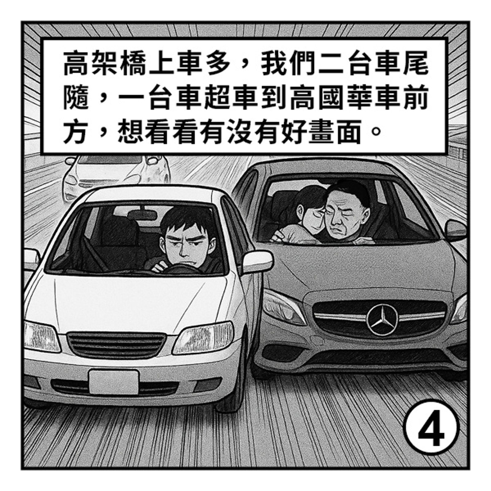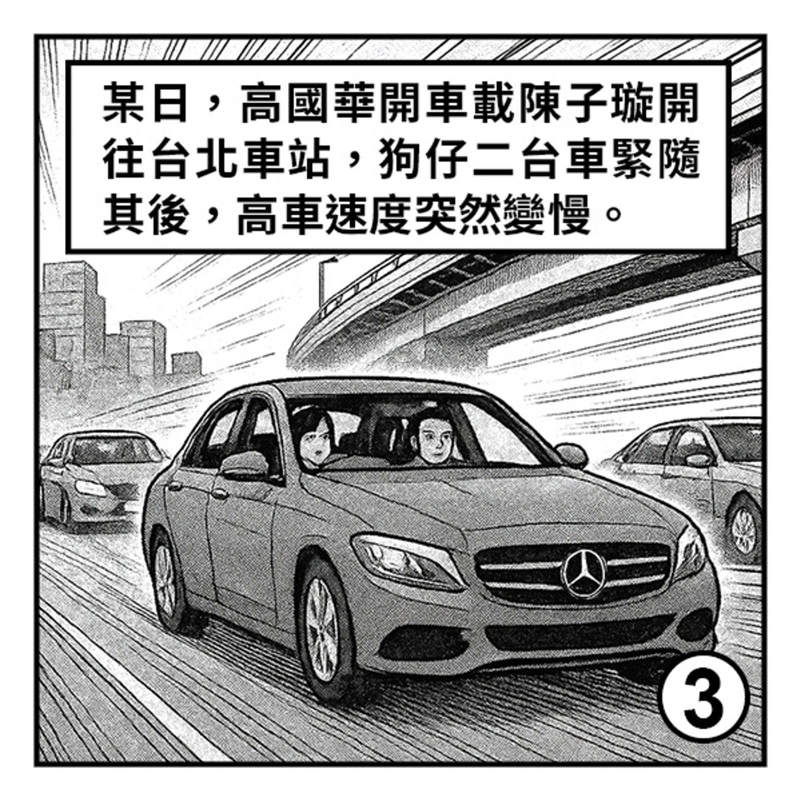 我們有兩台車在後面尾隨,突然間高的車速度有點變慢,有一台狗仔車想到:從前面繞過去看看有沒有好畫面。結果一繞到他們車前……不得了!