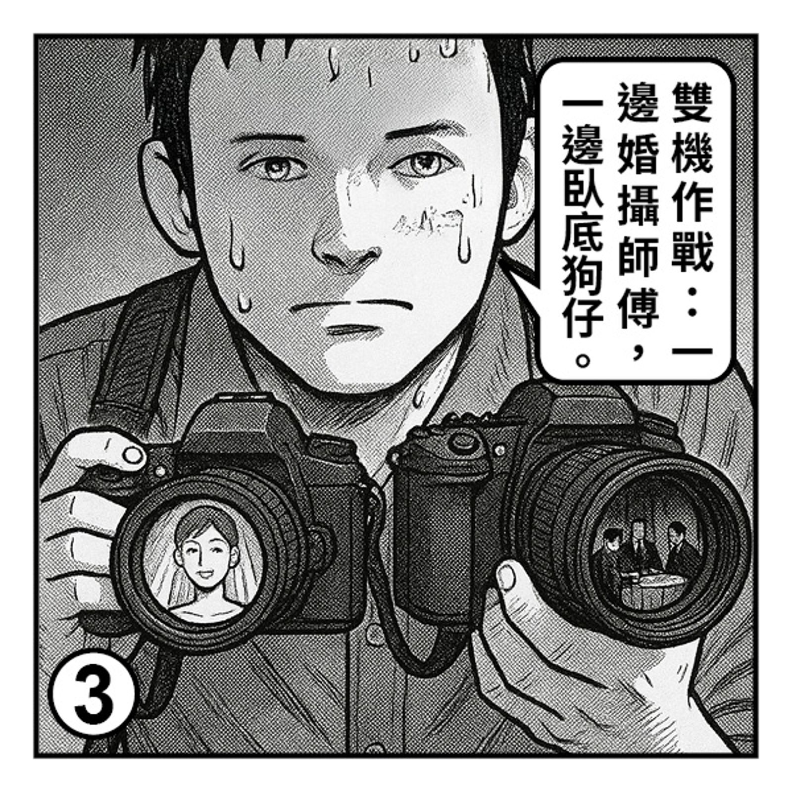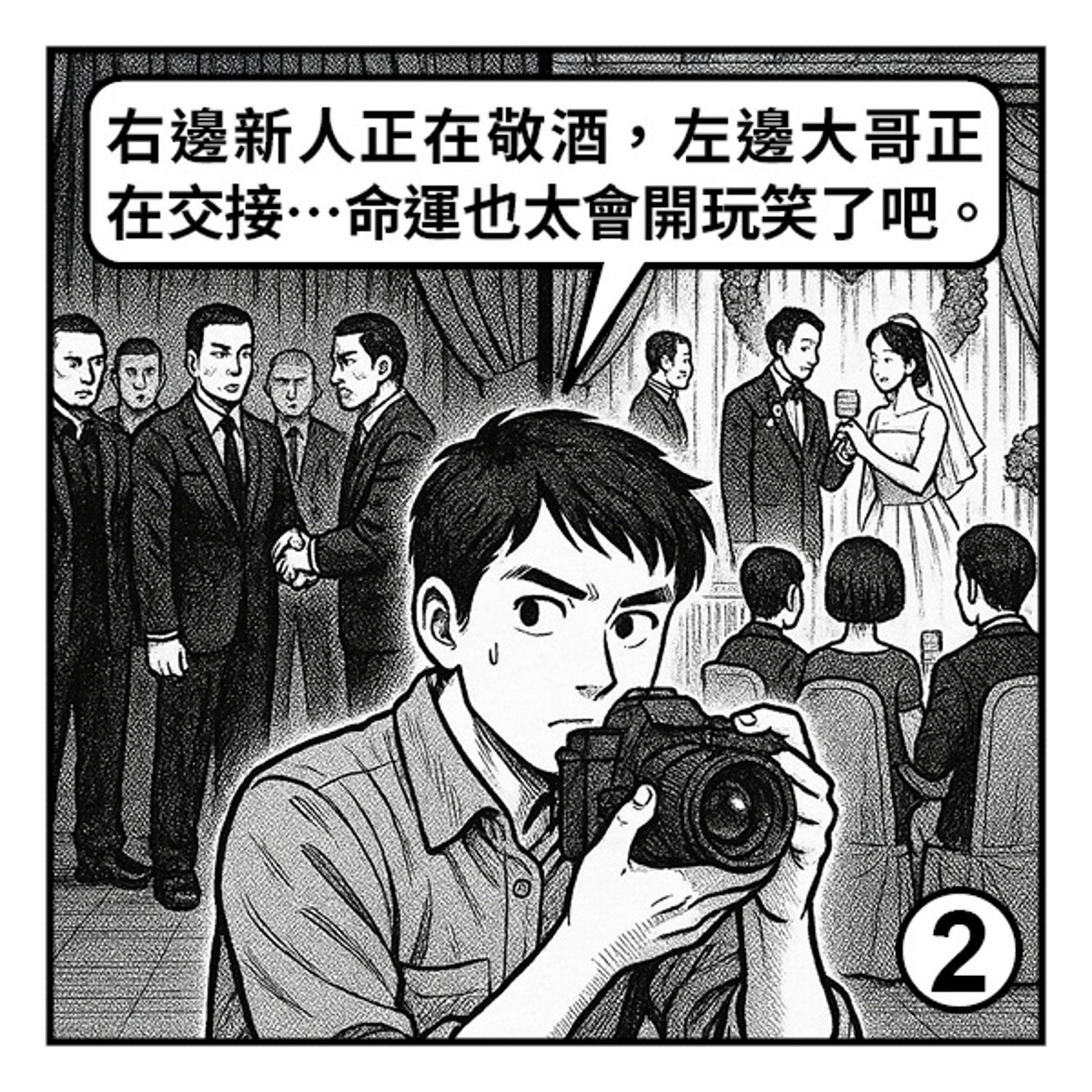 我手上拿著兩台相機,一台短鏡頭,拍新人、拍親友、拍笑臉,表面上看起來專業十足。另一台是長鏡頭,透過隔板縫隙直擊隔壁的黑道老大交接場面。這操作就像是同時在打兩份工:一邊是婚攝攝影師,一邊是臥底記者。