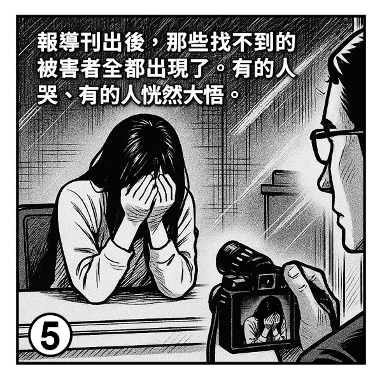 她們一個一個出來接受警方訊問,有的人崩潰痛哭,有的人不認,有的人看完影片後恍然大悟說:「原來,那晚我真的被下藥了。」這些畫面,讓我一輩子忘不了。