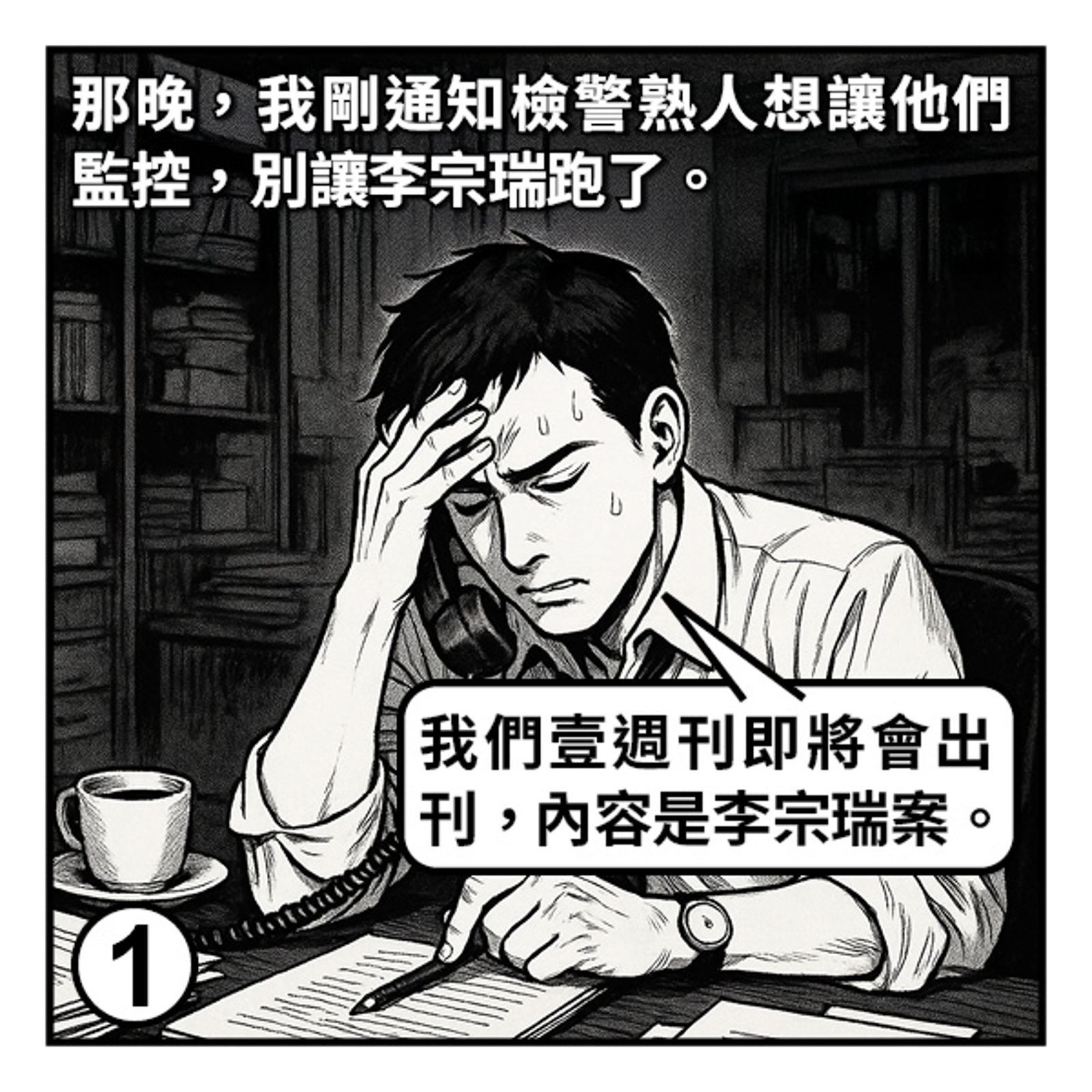 那天晚上,我才剛通報檢警的熟人:「我們壹週刊明天即將出刊,內容是李宗瑞迷姦案。」想讓他們提早監控,以免人跑掉。結果打完電話,不到幾小時,狗仔突回報:「李下樓了,開車離開了。」我一邊打電話給檢警熟人一邊罵:「X的,是誰洩的密?」,熟人說:「只有通知XXX去監控」,但結果根本是通風報信。我們出刊前一晚,李宗瑞跑了。