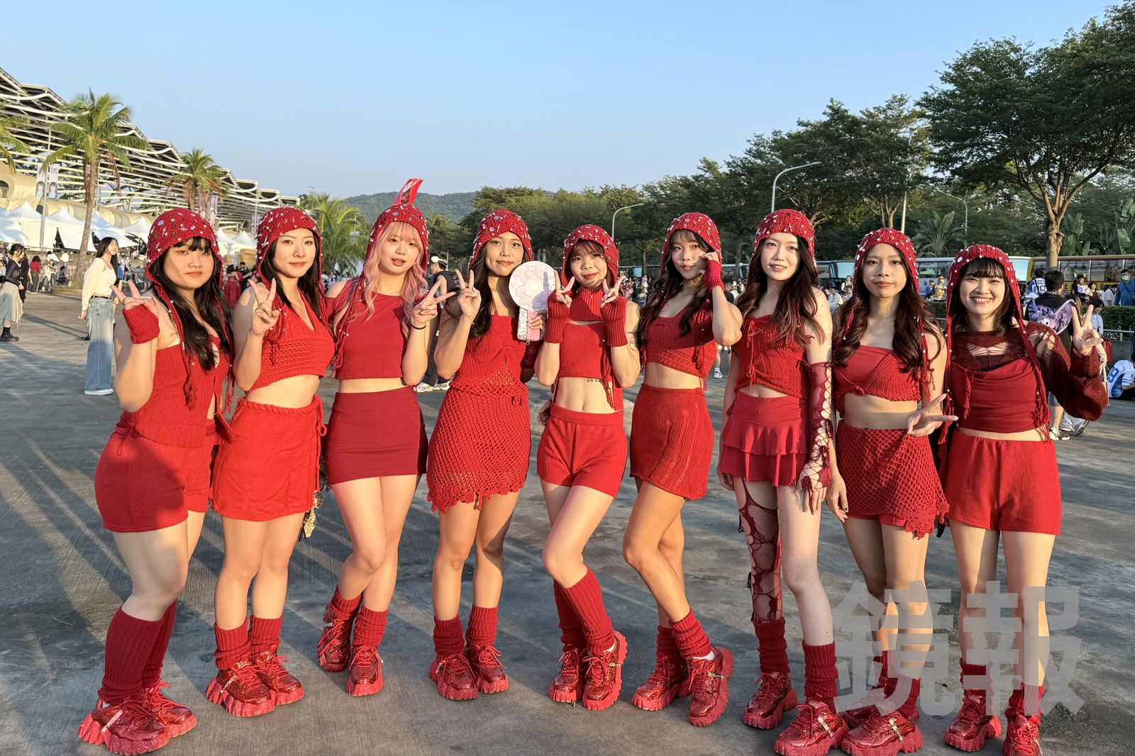 來自高雄的在地舞團Terp.Sii今特地打扮成TWICE巡演同名新歌〈THIS IS FOR〉的紅衣造型,在場外快閃熱舞,9人受訪時表示為了歡迎TWICE唱進高雄世運,特別做了MV的dress code,還有2人身上的衣服是手作針織的,透露請親友花了1個星期親自編織,十分有心。