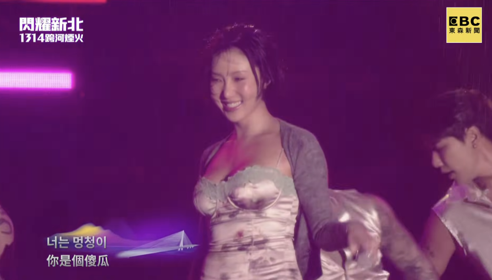 南韓人氣歌手華莎(Hwasa)今晚(31日)現身新北市跨年晚會「閃耀新北1314跨河煙火」,擔任淡水主場的壓軸嘉賓。她頂著不小的雨勢,身穿優雅洋裝搭配針織外套登場,第一首歌就帶來火熱的〈Chili〉,一上台便熱力大喊:「New Taipei! Make some noise!」,瞬間點燃現場氣氛。