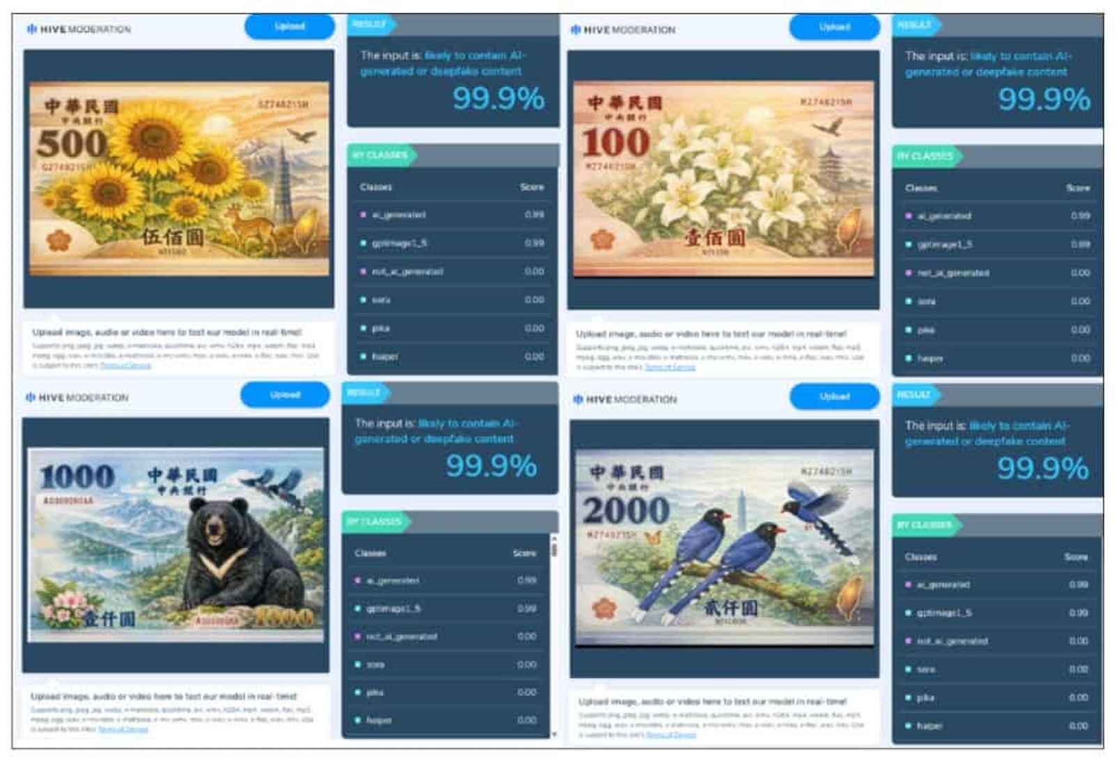 央行於115年1月27日啟動「臺灣之美」系列鈔券面額主題票選活動,活動中,只有以文字方式說明12項面額主題選項的構想,並沒有公布任何新版鈔券設計圖案。結果,網路上各種假借票選活動之名,流傳之相關鈔券圖案,結果台灣事實查核中心使用「Was it AI」、「Hive Moderation」等線上AI偵測工具檢測網傳圖片,發現有極高機率為AI生成。