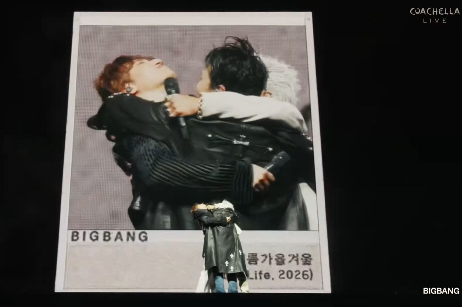 三人壓軸選唱的〈봄여름가을겨울(春夏秋冬)〉(Still Life)則超催淚,這首歌是2022年前隊友T.O.P離團前發行的最後一首歌,今天的科切拉演出中,BIGBANG更直接放出T.O.P的段落與原聲,隔空合體T.O.P,螢幕上則寫著「Still life.2026」,除了展現BIGBANG的成長,也顯現初心不變的深厚團魂。