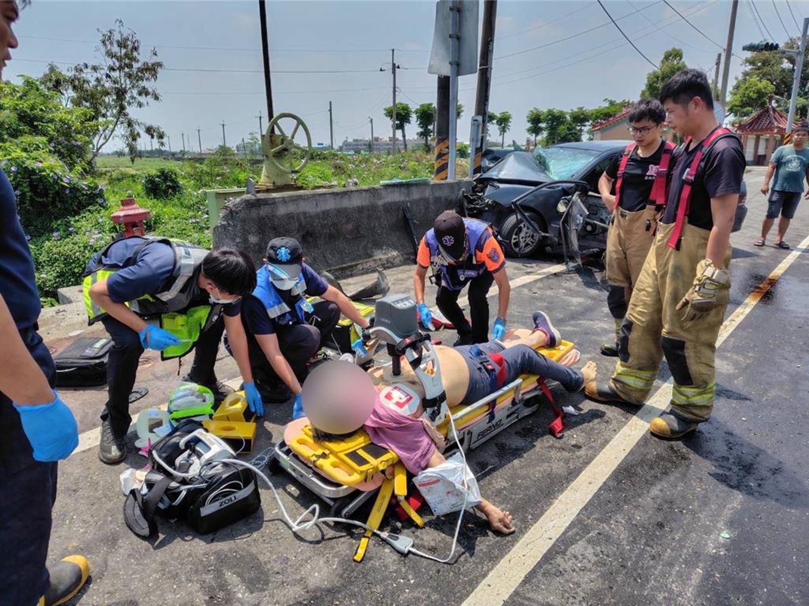 轎車在碰撞後失去控制,衝向路口右前方撞擊水泥護欄。由於該車車齡較老,車頭受撞擊後嚴重凹陷變形,導致丁姓女駕駛被困在駕駛座內,無法自行脫困。