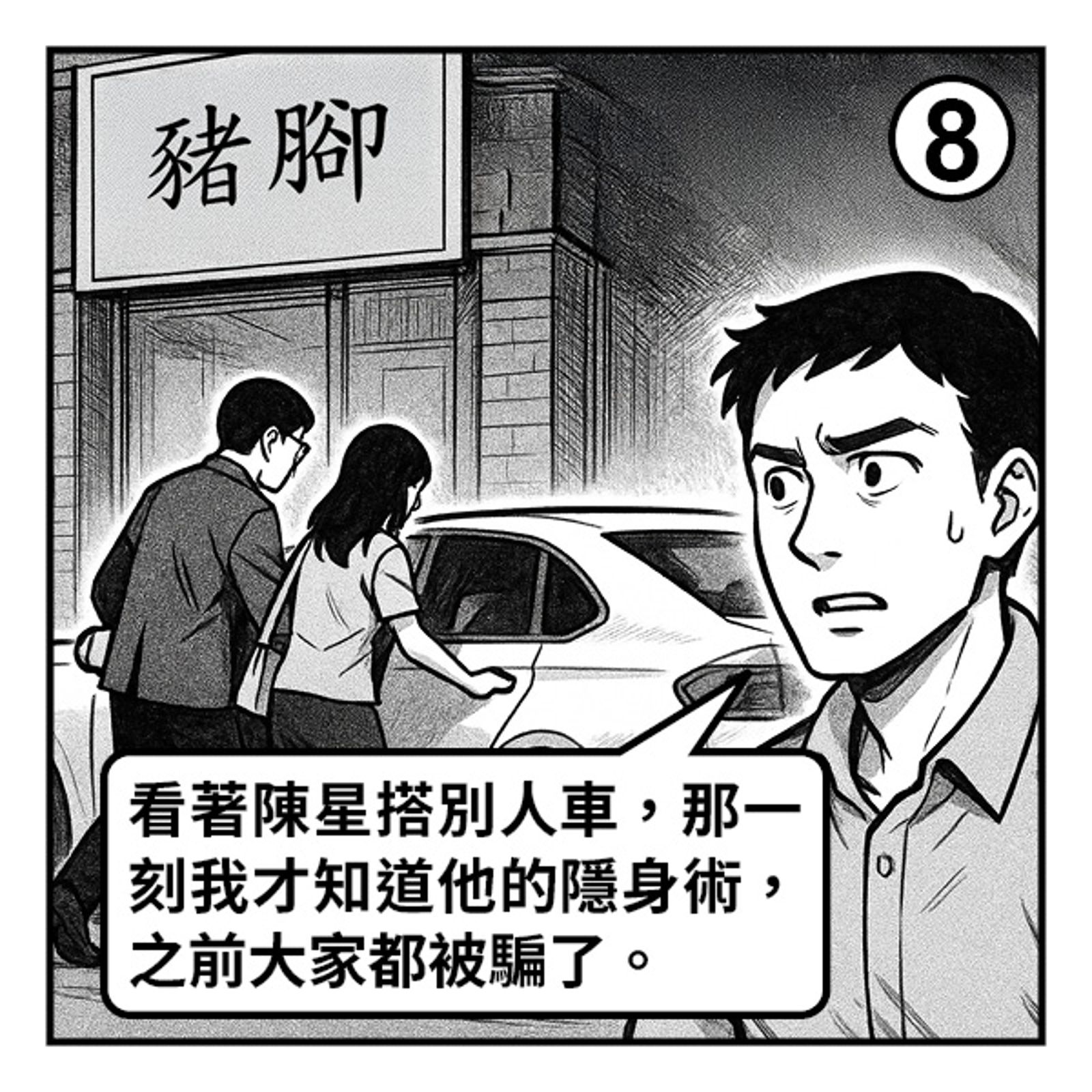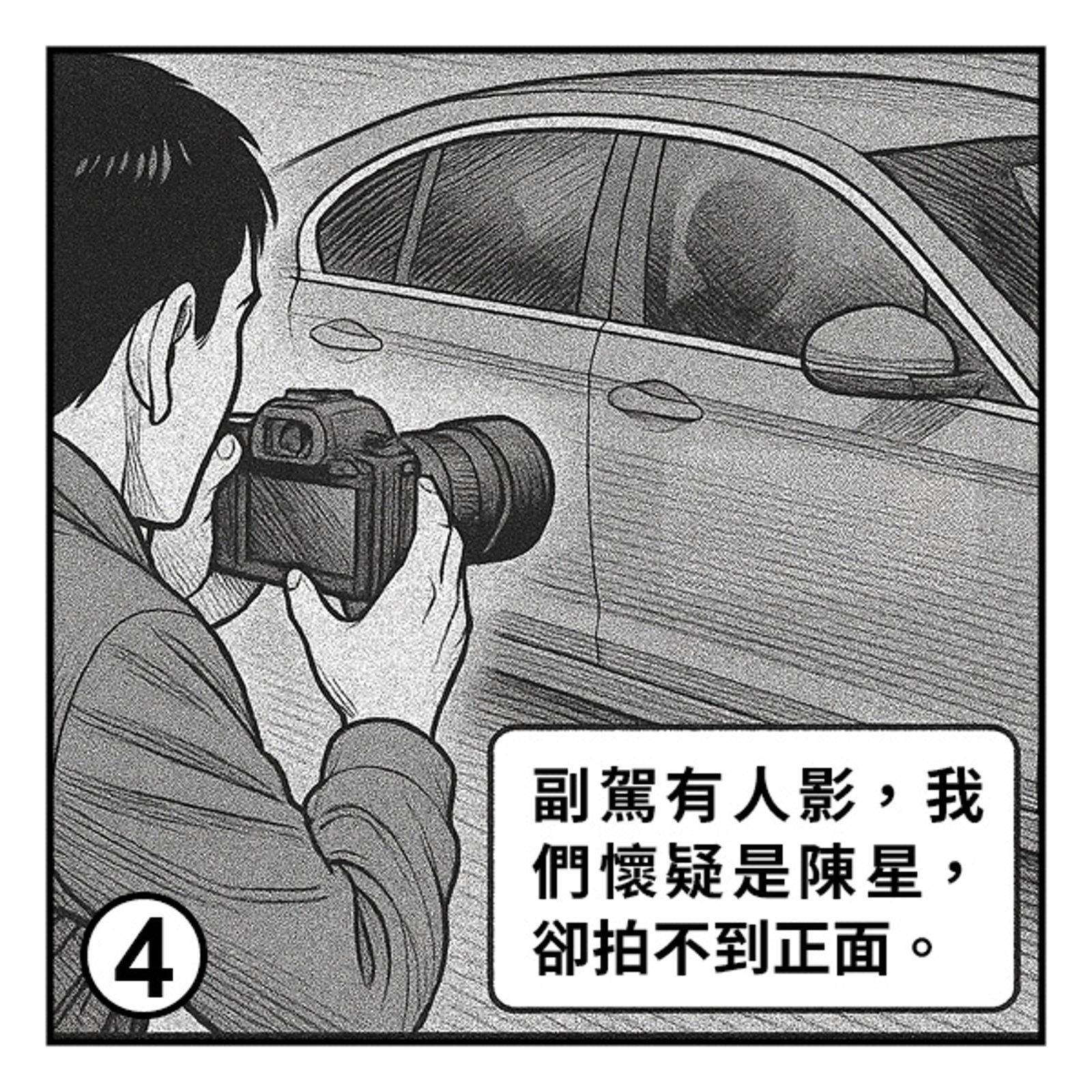 後來,他們又走進隔壁的豬腳店買東西,再搭上一輛我們沒見過的車回公司。這時我們才驚覺,之前苦守的那幾輛家用車根本是障眼法,他早就改搭其他人車輛,從另一個出口繞開我們所有監控。