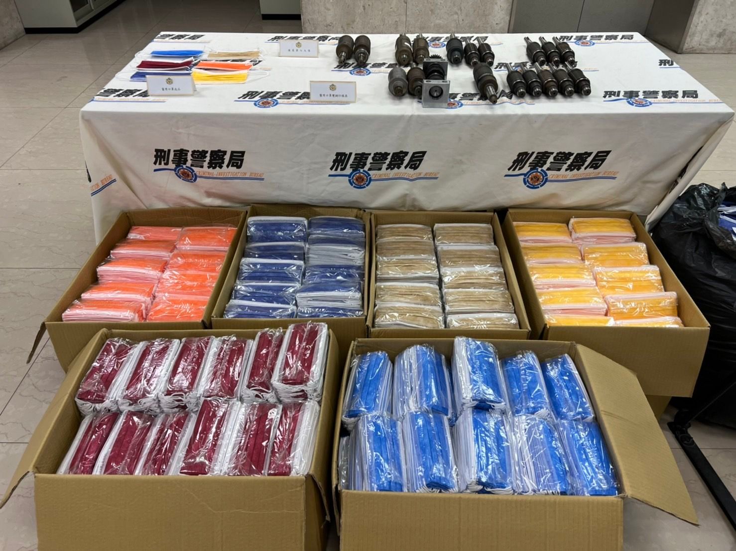刑事局表示,44歲姚姓女子等8人疑似於台中市潭子區設立地下口罩工廠,私設產線製造醫用口罩,還為了躲查緝,將非法口罩成品藏放於台中市大肚區、龍井區、大安區等4處倉庫。