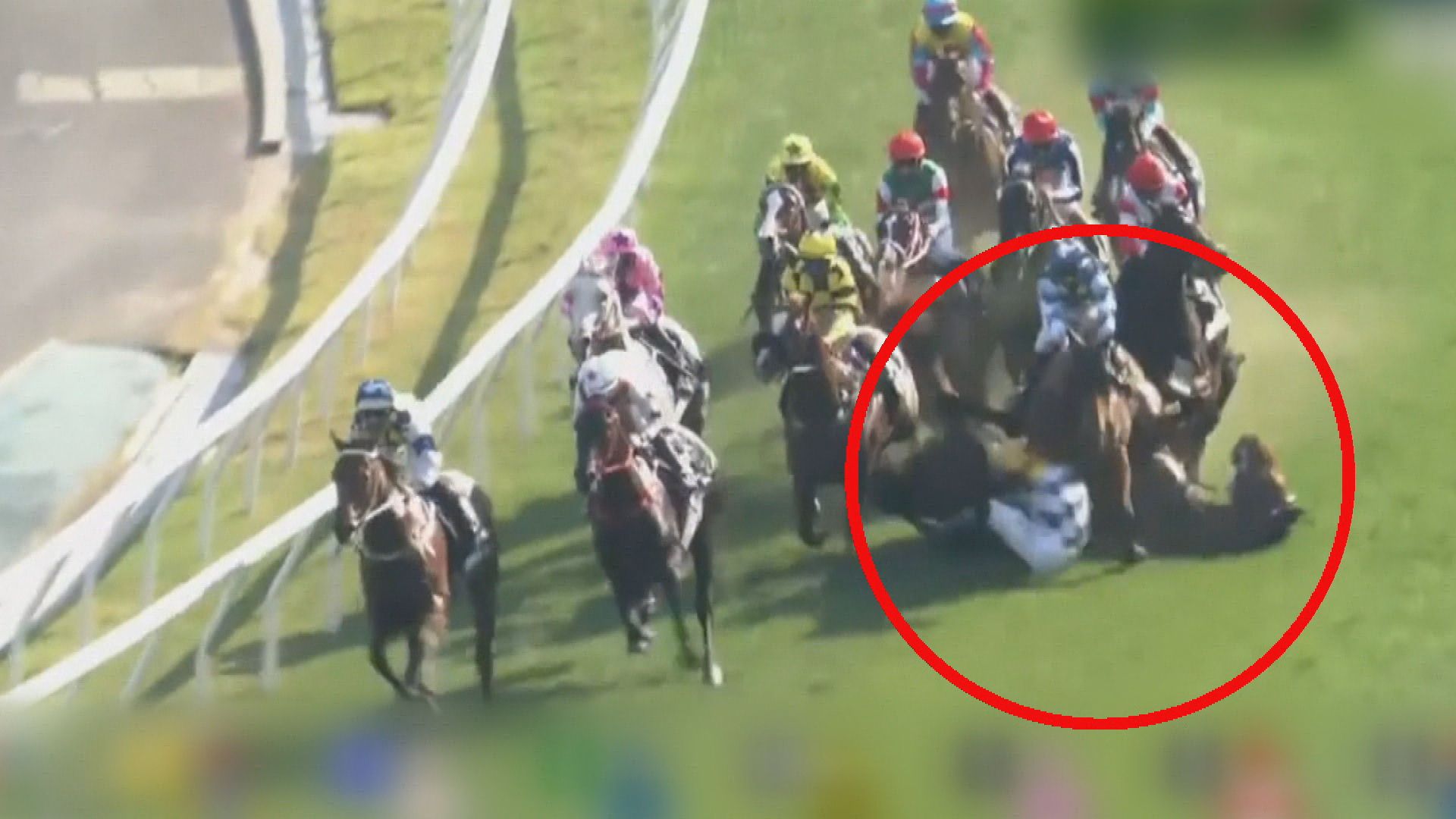 香港沙田馬場12日舉辦賽馬,卻發生賽馬連環撞的驚險意外,畫面上紅圈的9號「馬君達星」突然失蹄,連帶讓後面的3匹馬追撞在一起,4名騎師全都摔落地面,更有人被馬匹踐踏。