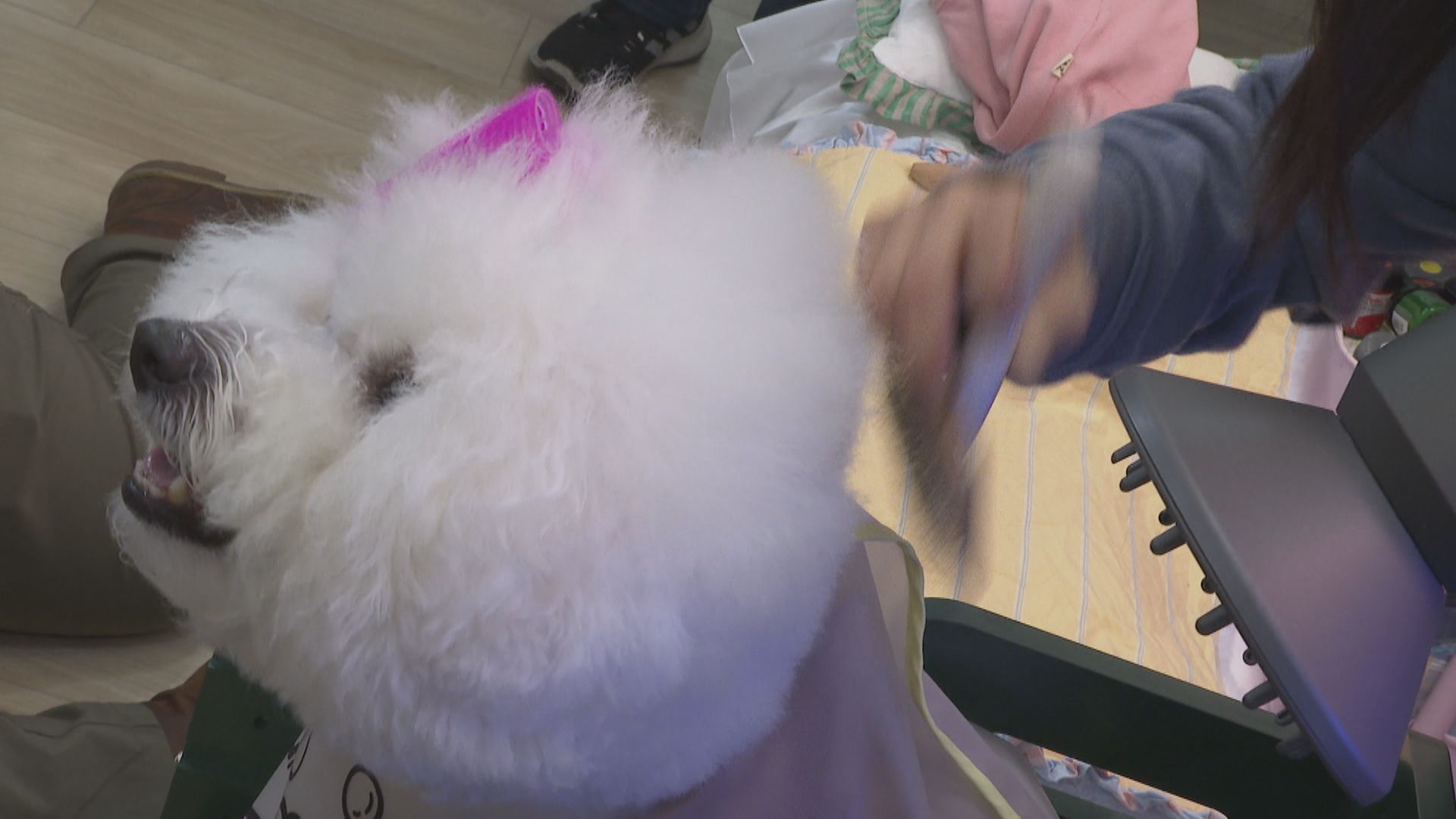 裝扮美美的迎接新年,包括家裡的毛小孩也得一起換新造型,超萌比熊戴上粉紅髮夾,再由專業美容師幫忙吹頭髮,為了保護毛小孩的毛髮和皮膚,敷臉也是一定要的,專為寵物設計的安親學校,寵物服務項目五花八門,想得到的、想不到的通通有,全日班800元,半日班則是500元,毛爸、毛媽們掏錢很痛快。