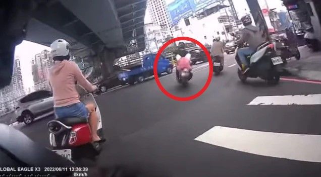 繁忙路段,一輛機車疾駛右轉,後座的粉衣婦人疑似反應不及,上半身往右大幅度甩動後失去重心,竟「下腰」後仰,無奈撐不住機車重催油門,婦人重摔地面。警方雖未接獲報案,但已循線聯絡上當事「祖孫」,確認阿嬤僅擦傷,無生命危險。
