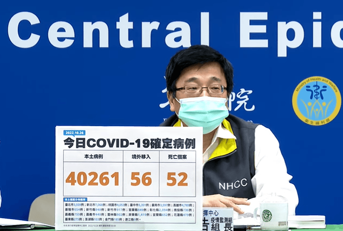 指揮中心指出,今日新增52例本土病例死亡個案,為20例男性、32例女性,年齡介於30多歲至90多歲以上,皆屬重度感染、48例具慢性病史、31例未接種3劑以上COVID-19疫苗。確診日介於今(2022)年7月9日至10月23日,死亡日期介於7月19日至10月23日。