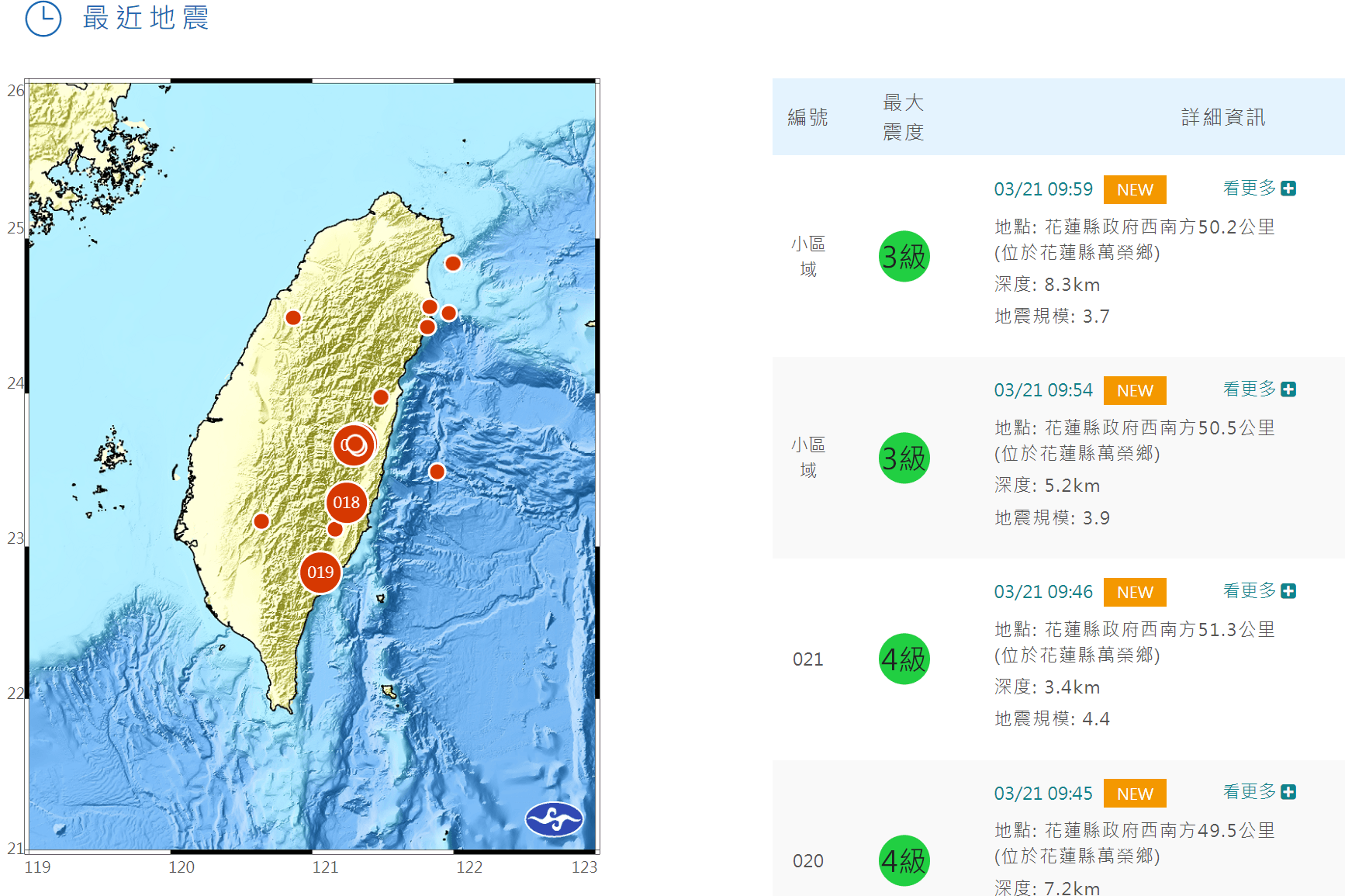 今上午連4起地震,包括上午9時45分花蓮萬榮鄉發生規模5.3地震,不到一分鐘,9時46分發生規模4.4地震,9時54分也發生一起規模3.9地震,9時59分再發生規模3.7地震,14分鐘內已發生連4起,前兩起被列為今年第20至21號顯著有感地震,後兩起則被歸類為小區域有感地震。