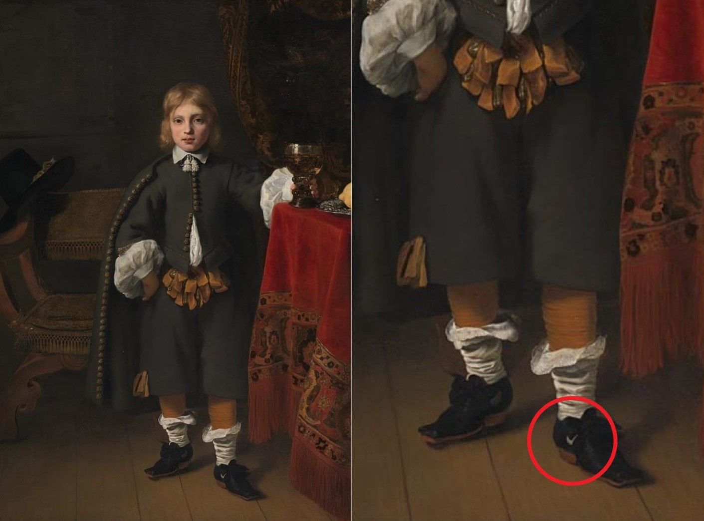 據《每日郵報》報導,57歲的女子福斯克特(Fiona Foskett)和23歲女兒荷莉(Holly)在位於倫敦的國家美術館(National Gallery)參觀,兩人在一幅17世紀畫作中看到不該在這年代出現的物品,畫中男孩身穿黑色斗篷外套、荷葉袖白襯衫,再搭配棕色褲襪、白色襪子,以及黑色鞋子,而鞋身竟出現「白色勾勾」符號,讓福斯克特不禁對女兒說:「他是穿Nike球鞋嗎?他看起來很時髦,或許他是時空旅人。」