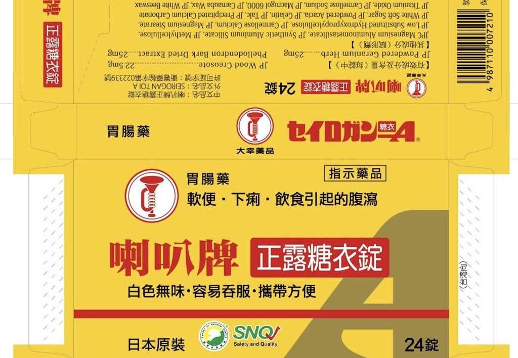 「喇叭牌正露糖衣錠 SEIROGAN TOI A(衛署藥輸字第022339號)」由台灣大幸藥品股份有限公司輸入,該藥品可用於治療緩解輕微或中度急性腹瀉等症狀。