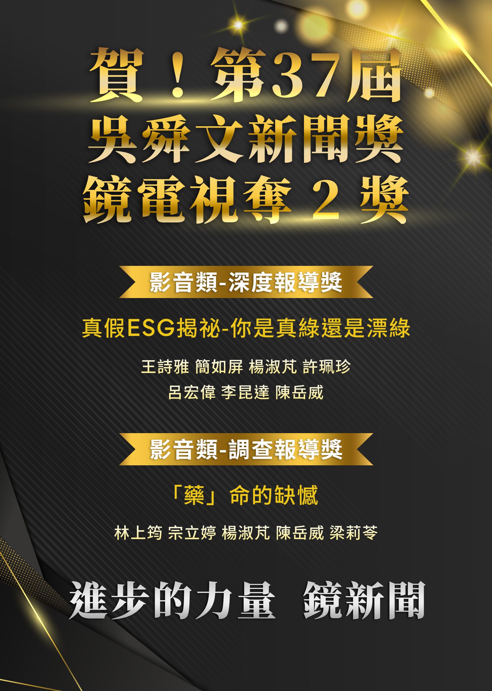 第37屆吳舜文新聞獎今(22日)舉行頒獎典禮,由《鏡電視調查報告》節目製作的《真假ESG揭祕-你是真綠還是漂綠》拿下影音類深度報導獎;《”藥”命的缺憾》更拿下今年首度設立的調查報導獎,成績相當亮眼。採訪中心副總監的林上筠代表上台領獎時,開心的表示,能拿到調查報導獎,真的是在新聞工作20多年很大的鼓舞!最後她還不忘打廣告,「鏡電視雖然在遠在天邊的86台,但我們有一群人,持續做該做的深度報導,每週六、日晚間8點86台,在媒體寒冬中繼續努力」!
