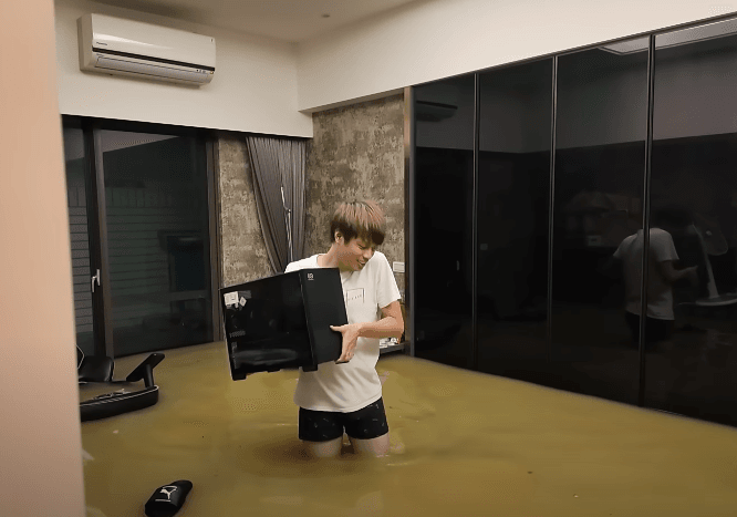 儒哥家門外的街道汪洋一片,有鄰居的鐵捲門還因此變形,畫面中雨從沒停過,畫面再度切換回儒哥住家後,水位全面上升,連客廳都淹起水來,儒哥只能穿著內褲邊喊臭、邊在水中拯救主機,車庫裡的機車也全都泡在水中。
