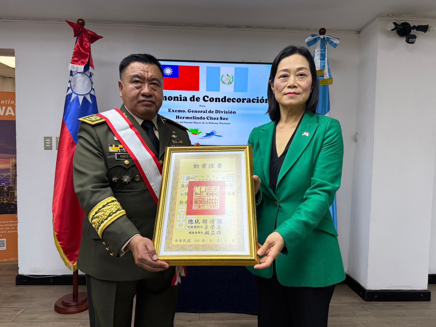 駐瓜地馬拉大使張俊菲於24日代表我國政府,頒贈二等雲麾勳章予瓜地馬拉參謀總長裘思中將,以表彰他長年促進台瓜軍事交流的貢獻。典禮在大使館舉行,瓜國副參謀總長、陸空軍司令與參謀本部等近40位高階軍官皆親自出席,場面相當隆重。