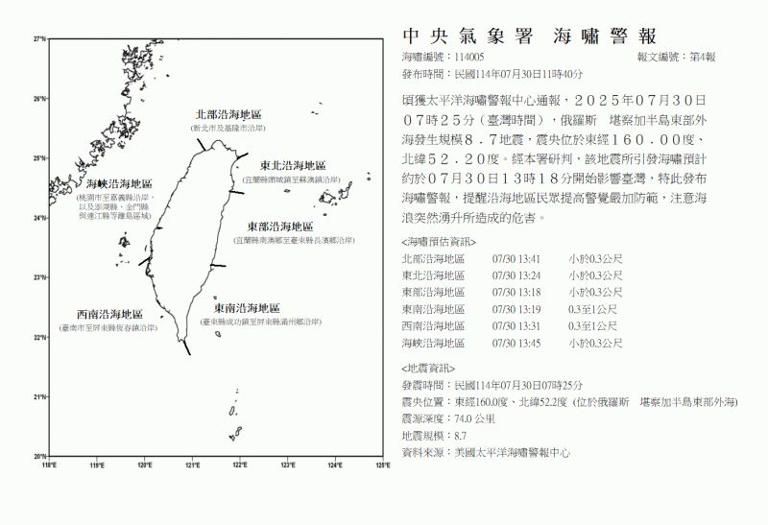 俄羅斯東部外海,台灣時間上午7時25分發生規模8.8強震,氣象署稍早發布最新海嘯警訊,初步研判,該地震所引發海嘯,預計下午1時18分開始影響台灣,提醒沿海地區民眾提高警覺,嚴加防範。