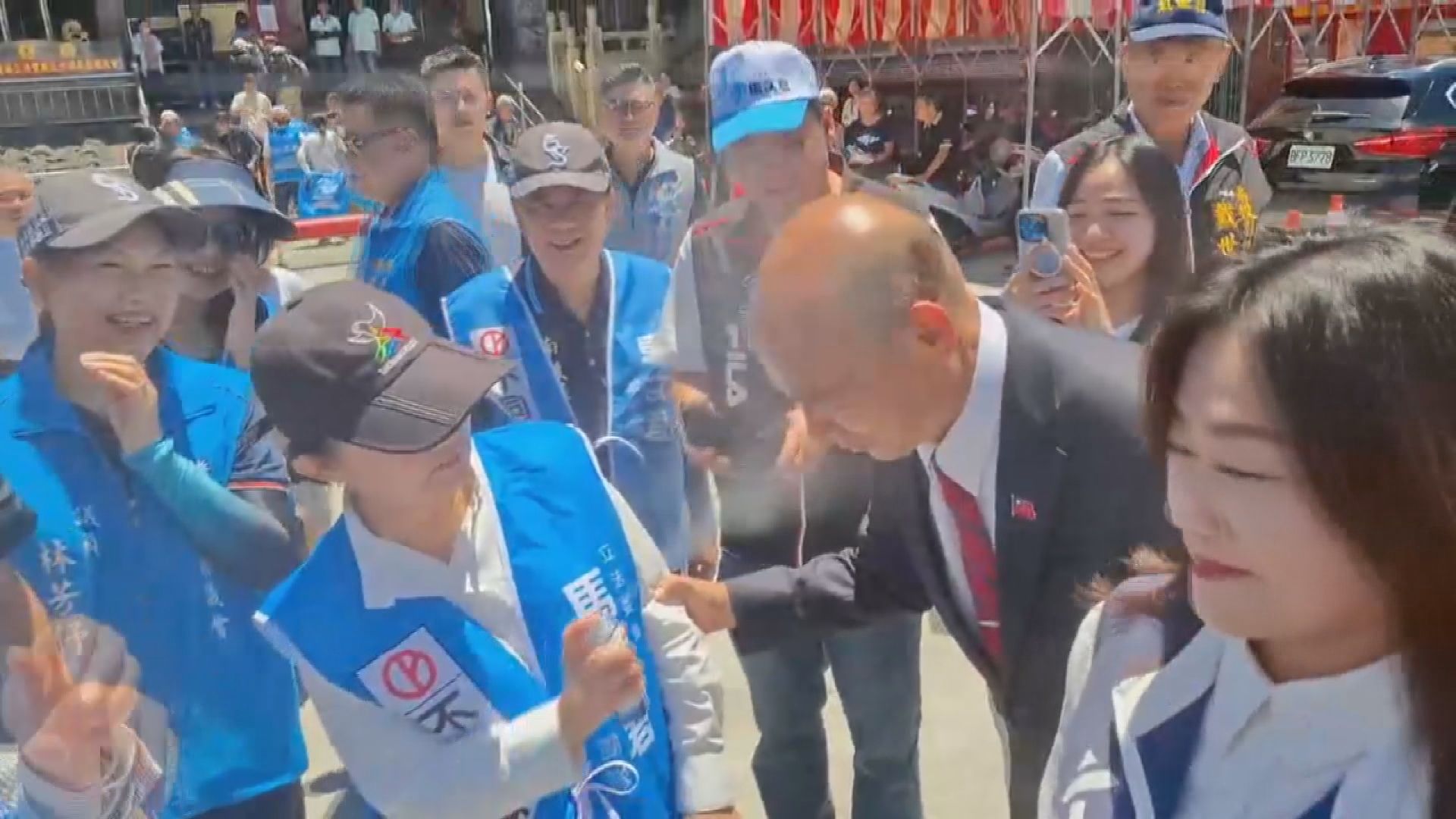 台中市長盧秀燕日前因完妝會勘引爆「粉底液之亂」,她今天(21日)特別請假1天,積極為反罷免及核三公投輔選,近中午陪同馬文君車隊掃街前,大方拿出防曬噴霧「噴了再上」,一旁的立法院長韓國瑜看到防曬神器,也趕緊將光頭湊上去「討噴」,盧還貼心提醒「眼睛閉起來」。