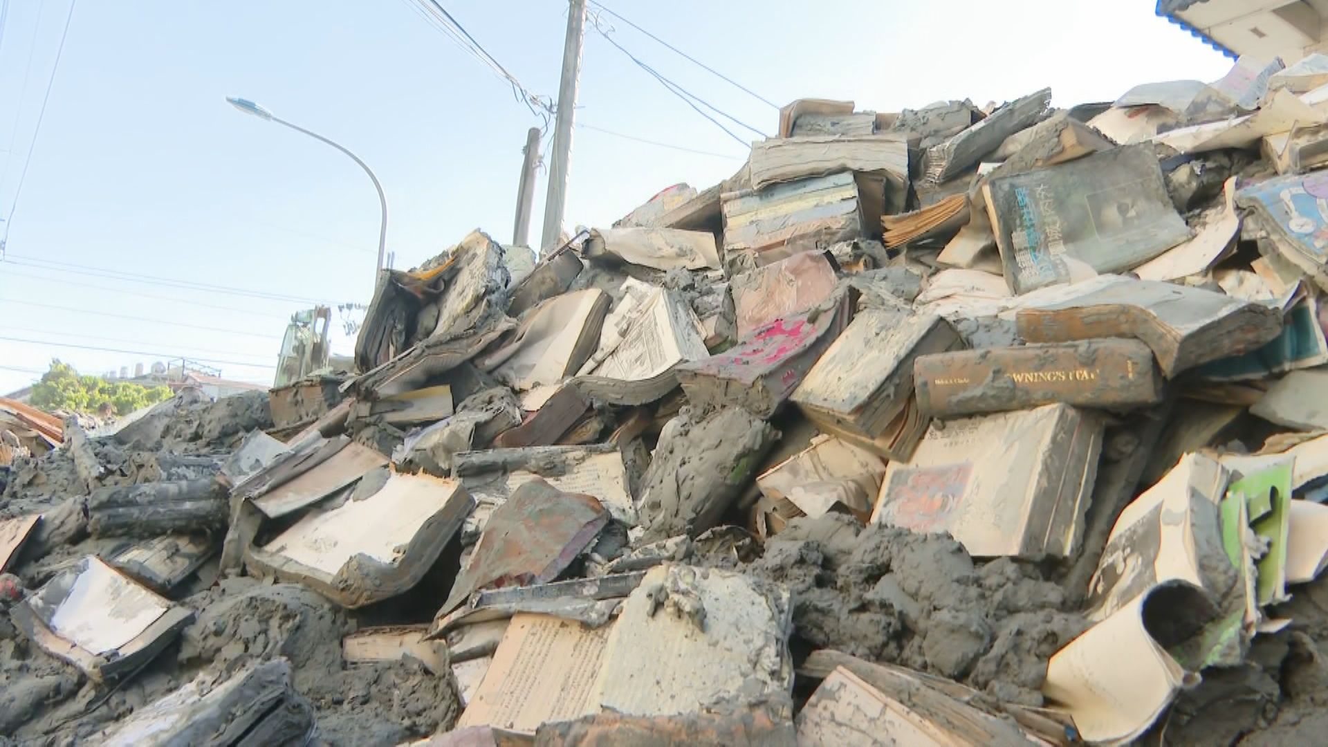 滿屋的書本全部沾滿泥巴,超過一半都被水沖走,志工們忙著清理搶救,知名作家赫恪就住在這裡,事發當下,75歲的他正在寫作,緊急躲到二樓,隔天才被鄰居救出。知名作家赫恪「聽到外面水來了,我趕快跑過來開門,水已經到門口,趕快關起來,轉身水都全部進來,朋友安慰說,人平安就好。」
