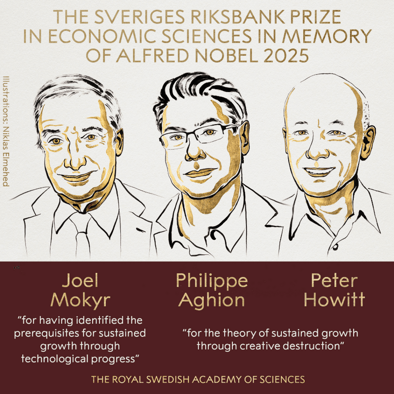 2025年諾貝爾經濟學獎今天出爐,頒給美、以雙重國籍學者、法國學者和加拿大學者等3個人,表彰他們在創新驅動經濟成長領域的貢獻。
