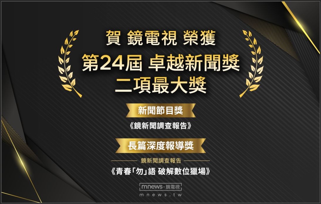 卓越新聞獎基金會今(18)日公布第二十四屆卓越新聞獎得獎名單並舉行頒獎典禮,鏡電視以《鏡新聞調查報告》榮獲最大獎「新聞節目獎」,專題作品《青春「勿」語 破解數位獵場》亦拿下「電視及網路(影音)類 長篇深度報導獎」,兩項大獎皆由鏡電視抱回,對長期深耕專題內容的鏡電視而言,是莫大肯定與鼓舞。鏡電視新聞部副總經理張玄會、採訪中心副總監林上筠親自出席典禮,林上筠代表團隊致詞時表示:「新聞人努力讓真相被看見,我們會繼續把光帶到、需要被照亮的地方。」