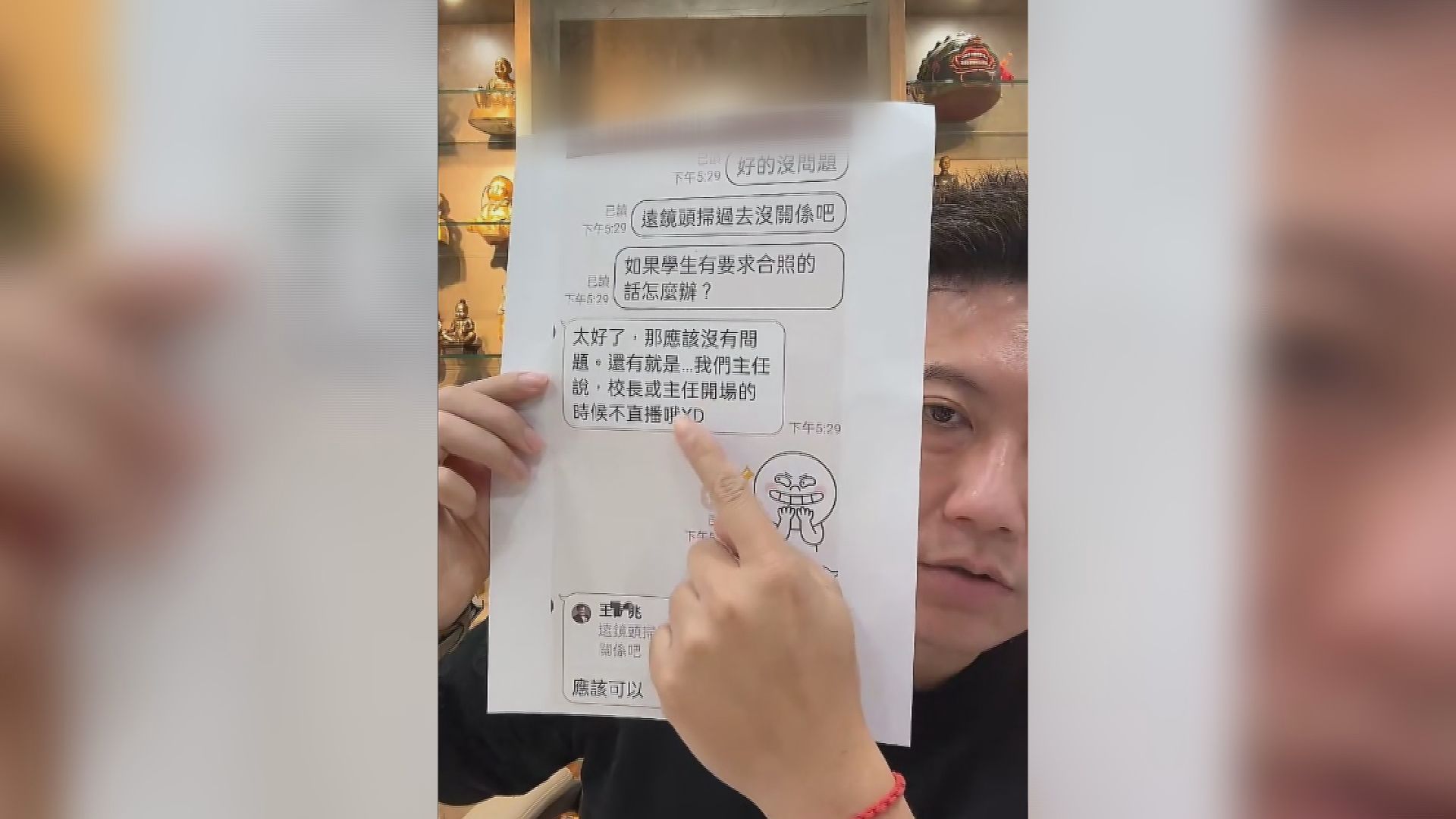 校方則出示完整對話截圖,反擊對方「斷章取義」。賓賓哥展示的截圖是11月11日的訊息,老師於11月13日明確回覆「不得進行直播」,活動當天也再次強調。至於賓賓哥宣稱獲贈感謝狀一事,校方說明,感謝狀是王元照臨時提出要求才緊急製作,但因賓賓哥擅自開直播,校方並未正式授予,他事後未經同意自行將感謝狀取走,校方已對此報案並完成提告程序。