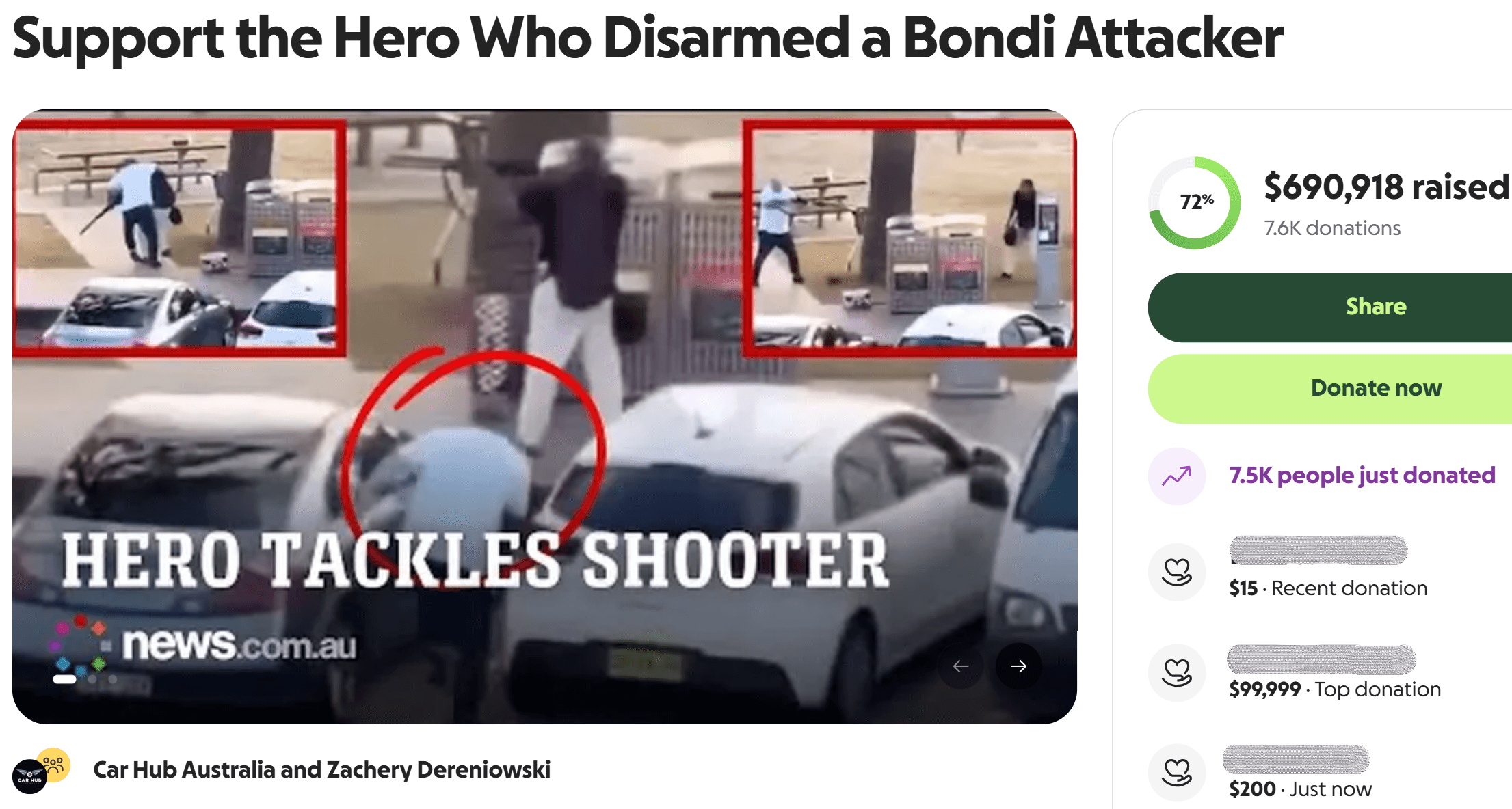 白色上衣男子從車子後方衝上前,徒手擒抱持槍開火的槍手。經過一陣扭打後,成功奪槍。他是這次澳洲槍擊慘案中的英雄,43歲的穆斯林艾哈邁德。而在奪槍後,他持槍逼退槍手,隨後再放下槍,澄清自己不是嫌犯。艾哈邁德的英勇舉動被拍下來上傳社群,獲得廣泛讚揚。但他也因此身中兩槍,緊急送醫急救。艾哈邁德表弟Mustafa:「他(艾哈邁德)有動手術,但我們希望他沒事。他是英雄!100%!他是英雄!因為我們在社群媒體看到的,他就像100%的英雄!」