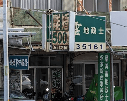 日本網友造訪台南,拍下路上「離婚500」招牌,再度引發話題,這家在地老字號事務所意外爆紅成為旅遊景點,有媒體找上門訪問,代書葉美雲證實,離婚證書一式三份500元,不過須外加2位證人費用,離婚收費總計2,500元。