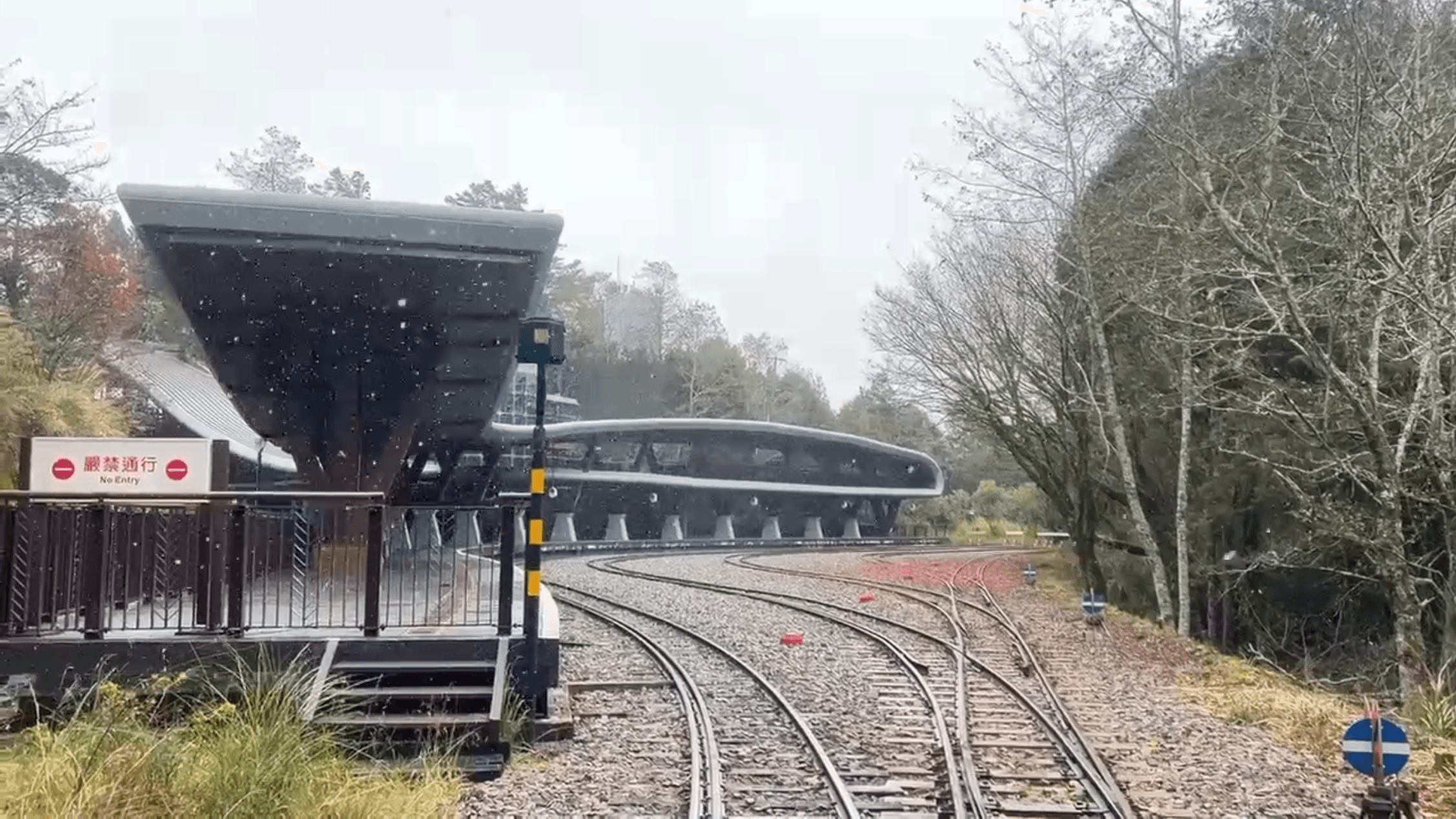 阿里山氣象站8日早上8點55分到9點15分,下起短暫20分鐘的大雪,但遊客興奮地喊著:「下雪了!」深色的樹木照映著白雪特別清晰,仔細看,雪花越來越大,這景象 真的十分罕見,還有遊客拍下祝山車站大雪紛飛的畫面。