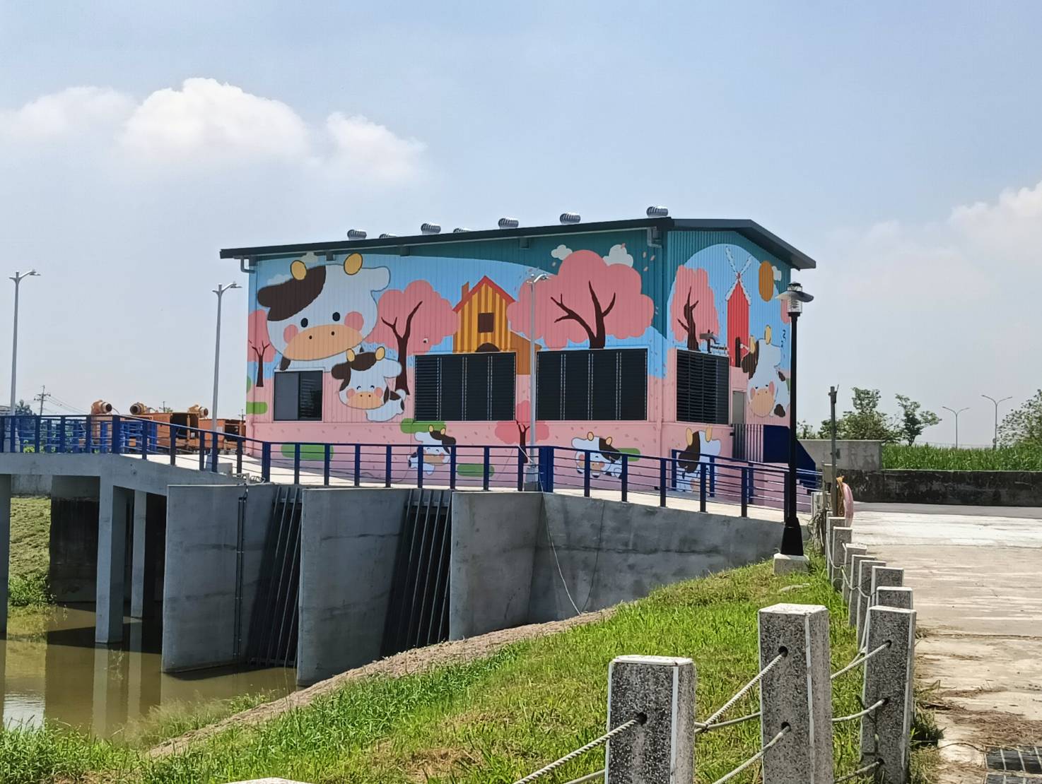 臺南市長黃偉哲為改善柳營區士林里櫻花社區受強降雨易淹水問題,積極向經濟部水利署前瞻計畫爭取5,400萬元辦理「柳營區櫻花社區抽水站治理工程」,已於今(115)年4月7日啟用,水利局日前進行該站防汛操作演練,為即將到來汛期做好萬全準備。水利局結合在地酪農及滯洪池公園特色,將抽水站外觀設計俏皮風格的乳牛及櫻花樹意象,使水利工程不僅守護市民免於水患,也為社區環境增添活潑亮點。