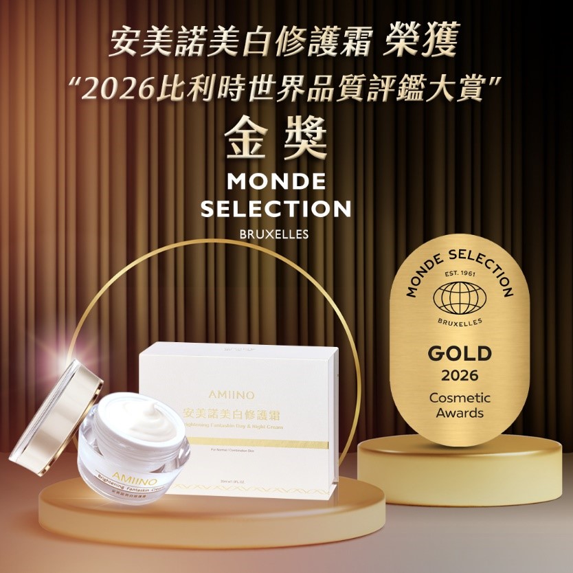 由台劇女神蘇晏霈代言多年的「安美諾美白修護霜」,不僅擁有台灣最高榮譽SNQ國家品質標章,早就榮獲不少獎項肯定如國家品牌玉山獎、FG專家認證,以及2022抗老大賞 最佳電商乳液、乳霜等。如今再傳捷報,連續榮獲2025、2026年比利時世界品質評鑑大賞Monde Selection「金獎」殊榮。該獎項如消費品界的奧斯卡獎,是全世界最高品質的標竿指標,也更加提升消費者信賴度。