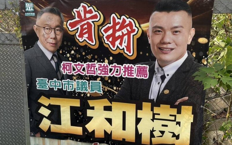 民眾黨台中市議員江和樹與創黨主席柯文哲的選舉布條,日前遭人惡意塗鴉,陸續寫下「貪污」、「垃圾人」等字,台中市警局霧峰分局經調查,鎖定2名涉案男子,兩人分別在不同時間塗鴉破壞布條,其中59歲陳姓男子已到案坦承犯行,另名嫌犯仍在追緝。