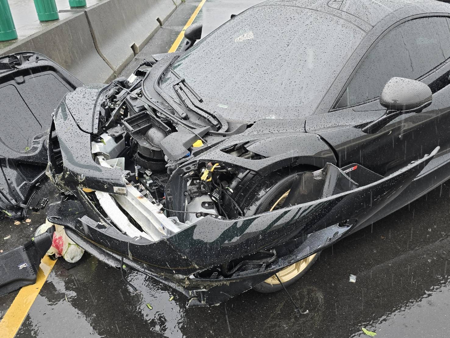 警方表示,該名肇事車輛的劉姓男子(36歲)當時駕駛麥拉倫超跑,沿洲美快速道路從北投往士林方向行駛,至肇事處時,疑似因天雨路滑,前車頭撞擊分隔島而肇事,警方獲報後前往處理。