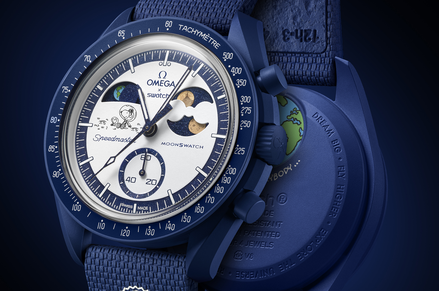 除正面顯示外,錶背電池蓋上的地球圖樣也有額外心思,使用UV油墨印製,需以UV光照射才能浮現藍光水域層次,與正面地球盈虧顯示呼應成對。「I beat everybody...」則出自漫畫家 Charles M. Schulz 所創作的《花生漫畫》一格。其中 Snoopy 穿著太空人裝,站在月球表面,驕傲地說出:「I beat everybody...」,是對當時正進行中的美蘇太空競賽的幽默回應:Snoopy 搶先兩強登陸月球。