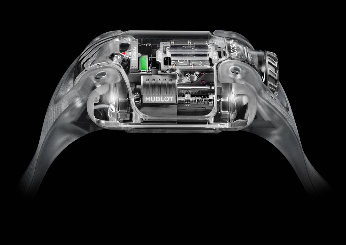 搭載的HUB9013 機芯由 592 枚零件組成,厚度 14.9 毫米,重量僅 38.4 克。採雙側 22K 白金滑軌上鍊模組,以線性運動儲能,搭配 35° 傾斜飛行陀飛輪。四組滾軸顯示時、分、秒與動力,三色動能區間清楚標示。操作方面:12 點方向錶冠用於手動上鍊,背面嵌入式旋鈕則用於調校時間。