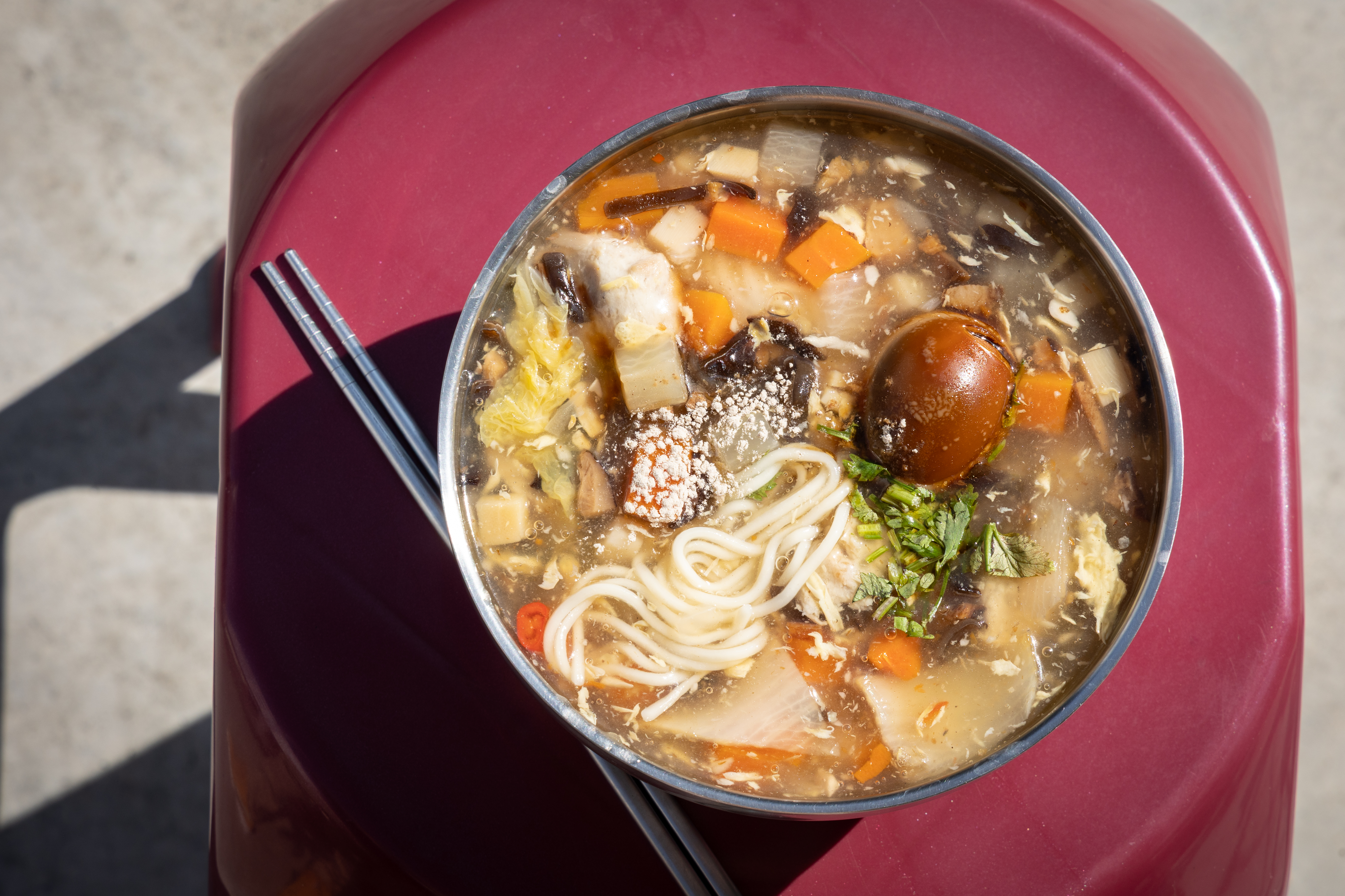 細嘗他的魯麵,有總舖師才會注意到的細節和堅持,很有水準。這個南部才有的魯麵,和打滷麵還是不同,打滷麵又名熗鍋麵,重點是現點現做,一定要有鍋氣,像他隔壁的肉粿,材料都有,但現點現做,鍋氣十足,感覺就不同,大家為了鍋氣,排隊也甘願。我建議他把羹湯煮好在一旁,客人點了麵之後,大火現炒菜蔬加麵快炒,才淋上魯麵羹湯,最後加新鮮蛋汁,盛碗上桌,這樣添增鍋氣的做法,或許是抓住客人的要素。