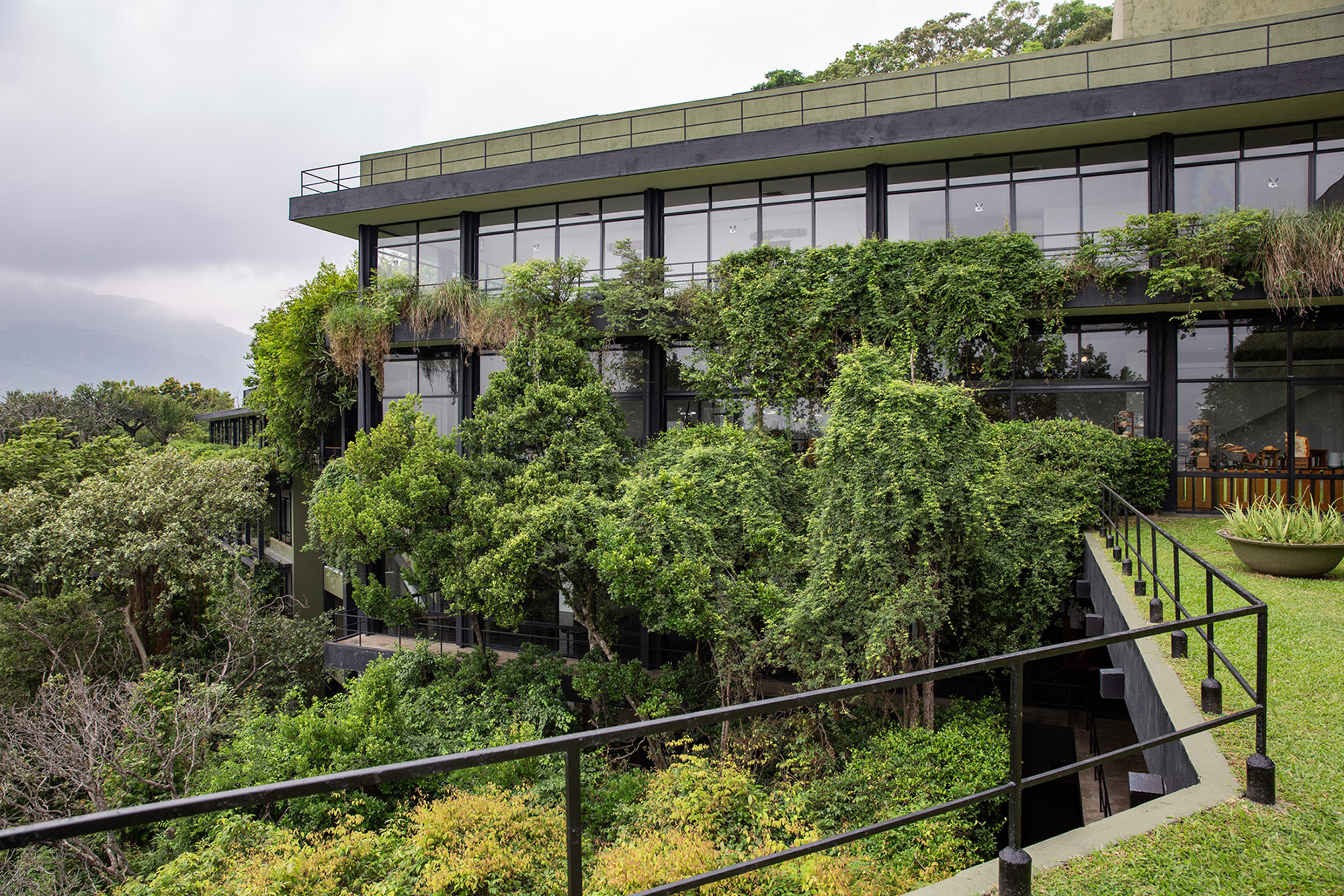 看似封閉的走廊,其實通風良好,光影在空間中自然流動。這是一種不依賴空調、源自建築師對氣候深刻理解的舒適。屋頂以斯里蘭卡銅打造,如今氧化成沉穩的綠色,顯得格外耐看。