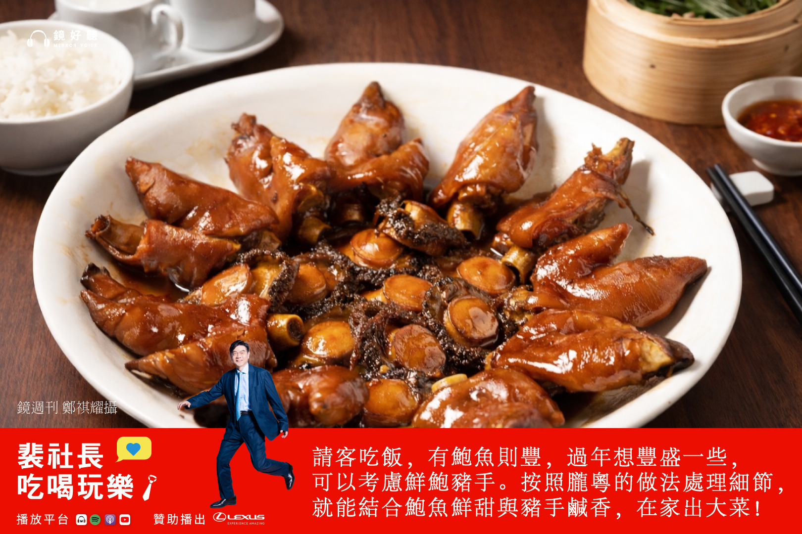 「鮮鮑豬手」是具有豐盛吉祥涵義的年節主菜,裴社長建議使用南非活鮑魚或貢寮九孔烹煮。他還在節目中分享簡捷明師傅的料理祕訣:煨鮑魚時要用燉鍋,並將鮑魚置於老母雞、豬骨與雞腳之間,調味料只加冰糖與老抽,不能加鹽,避免鮑魚縮水,慢火煨煮三小時後,再加入蠔油提味,全程不加醬油,以防湯汁變酸。