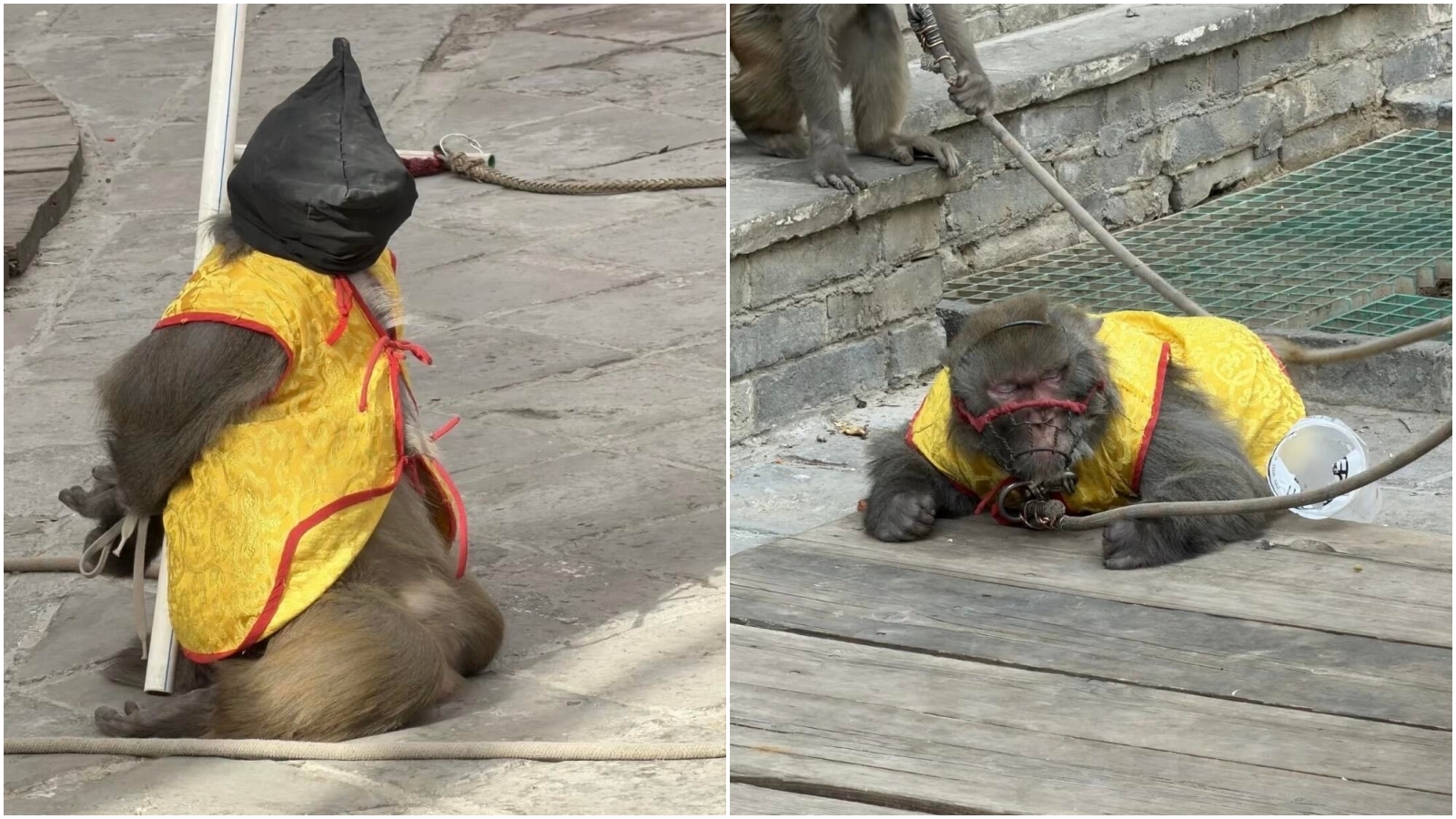 照片可見,1名猴子身穿黃色背心,遭雙手反綁在一條棍子上無法動彈,頭上則被蓋上黑色面罩,猶如被當成死刑犯;另外一張照片更可清楚看見牠身上有傷口,被戴上金屬嘴套及牽繩,在地上爬行。