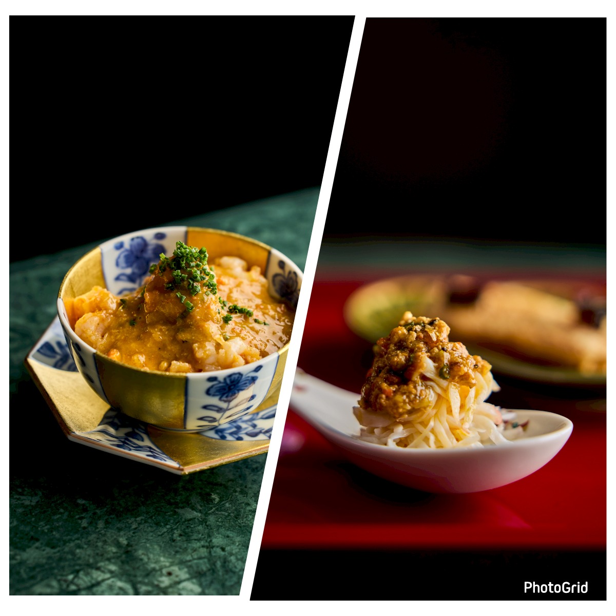 出乎我意料的是,在蟹這件事上,宗哥與主廚團隊根本沒耍任何虛頭巴腦的花招,直球出擊地端上一匙貨真價實的「蟹」,下方是廚師精心拆出的北海道帝王蟹肉,上面堆疊了融合大閘蟹、紅蟳、處女蟳、鱈場蟹的蟹黃與蟹膏,旁邊樸實地放了一塊極酥脆的炸響鈴,唯一的花樣是把蟹醋做成螃蟹形狀的醋凍,大口吃下,融合多種蟹的蟹黃蟹膏甘醇鮮美,直接在口腔裡爆炸,帝王蟹肉的甘甜也沒被壓制,是名符其實懶人版的蟹蟹大餐(完全不用自己動手拆蟹),一口下去只能用幸福來形容。