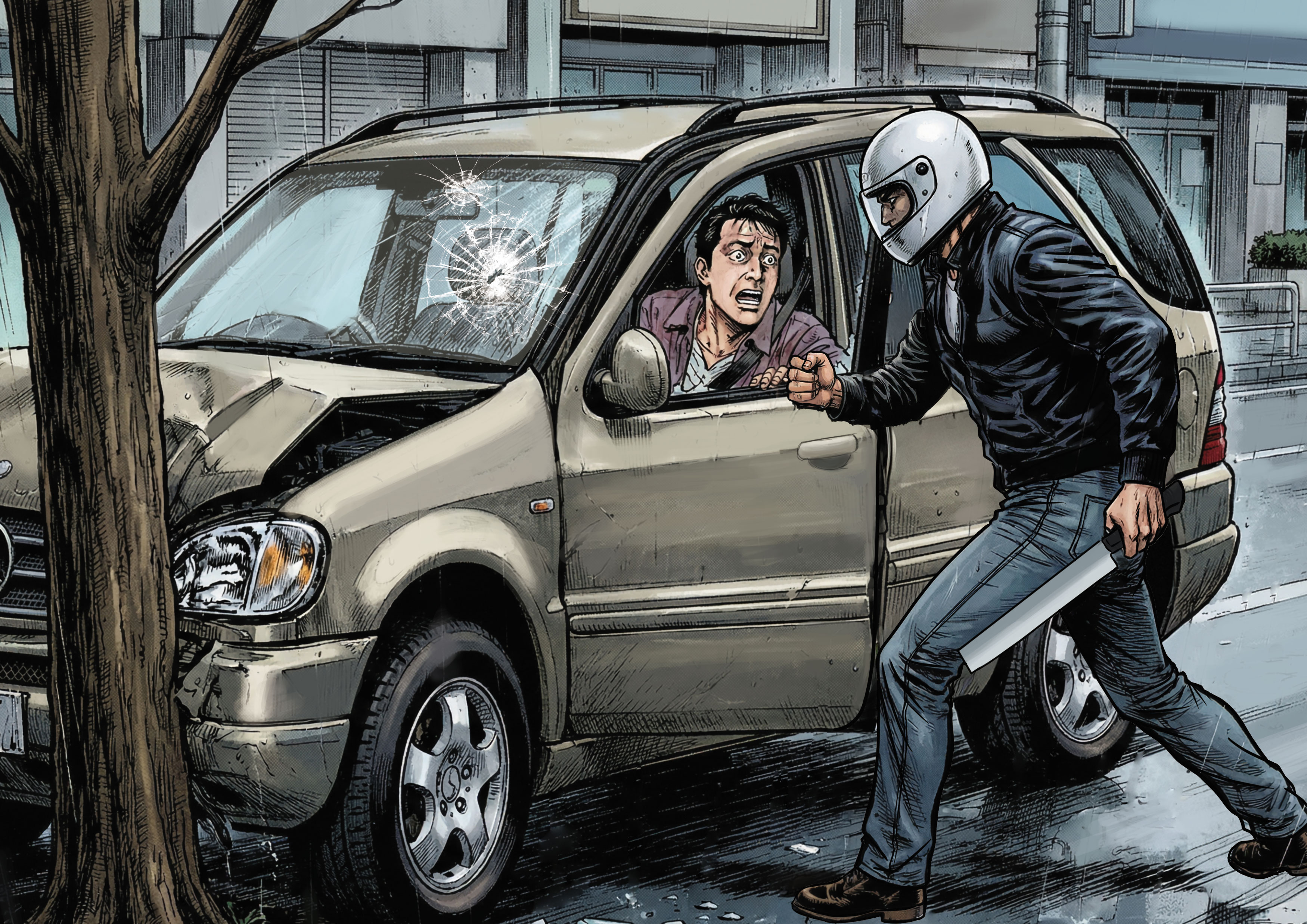 鑑識人員抵達現場後,有目擊民眾告知警方,案發時見一輛機車緊緊尾隨休旅車,紅燈時,騎士把機車停在休旅車後方,拿了一把榔頭下車,接著走到休旅車前方,用榔頭猛砸擋風玻璃,休旅車駕駛見狀,立刻把車往右開,企圖加速離開現場,可能是太緊張,所以衝上人行道,撞擊路樹、站牌。