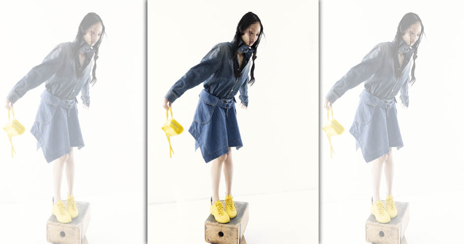 白色長襯衫的布料,以輕而完整的方式覆蓋下來,模糊了分類。一整片連續的布面,幾乎沒有多餘的訊號,只留下最基本的存在形式;與其說裙子消失,不如說它退到一個更安靜的位置,變成一種隱約存在的輪廓。