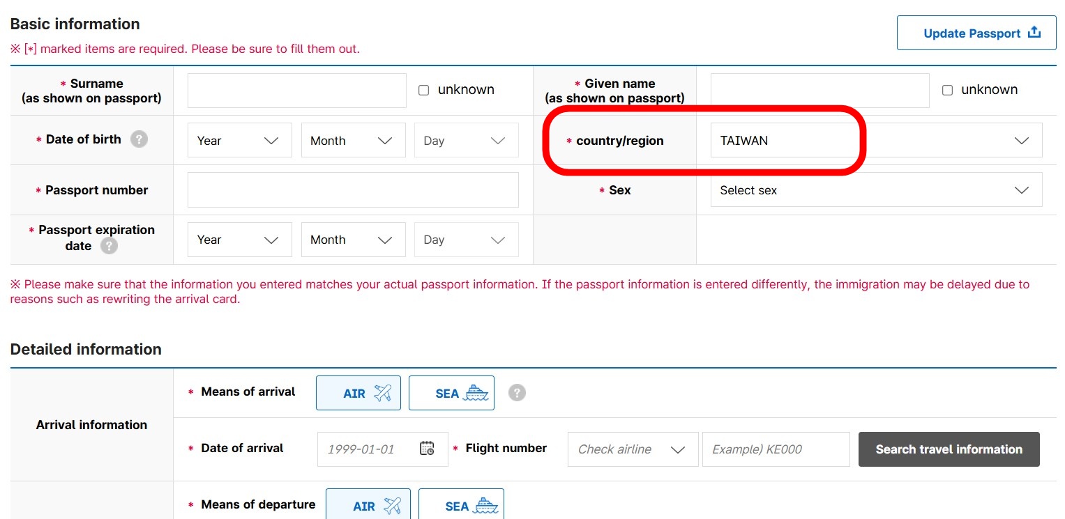 今日南韓電子入境卡系統頁面,原本的「出發地」及「下一目的地」欄位已經消失,僅留下「國家/地區」,我國選項顯示「TAIWAN」。