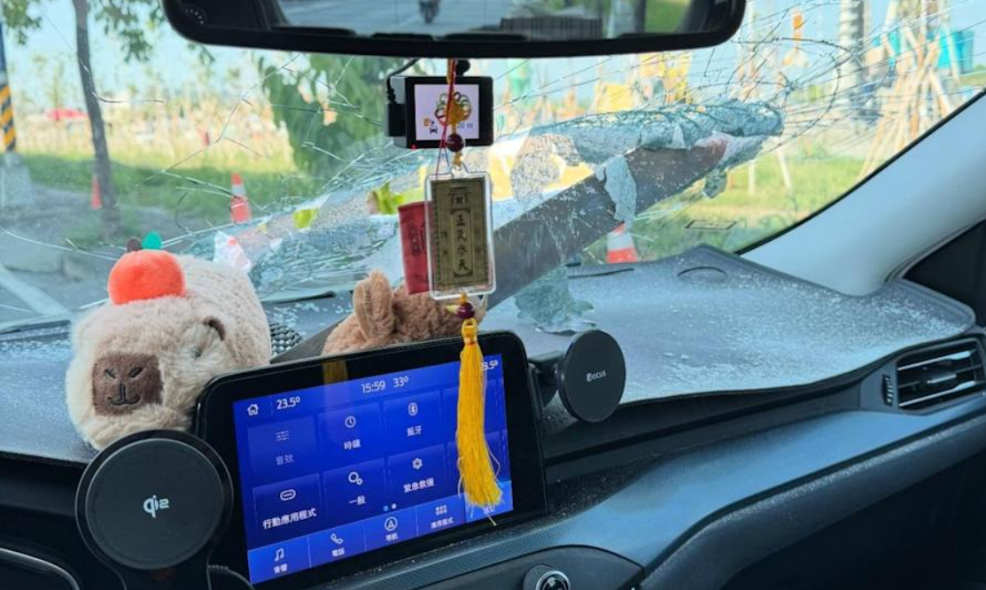 這起事件發生在13日下午3時25分,莊男當時行經國道10號東向5公里處,正從中線車道切換至外側車道,未料前方突然飛來不明物體,幾乎沒有反應時間,鐵條便重擊擋風玻璃。強大衝擊力讓玻璃瞬間碎裂成蜘蛛網狀,中央更被砸出大洞,碎片噴向副駕駛座,鐵條則卡在儀表板上。從行車紀錄器畫面可見,若偏移些許角度,極可能直接擊中駕駛,後果不堪設想。