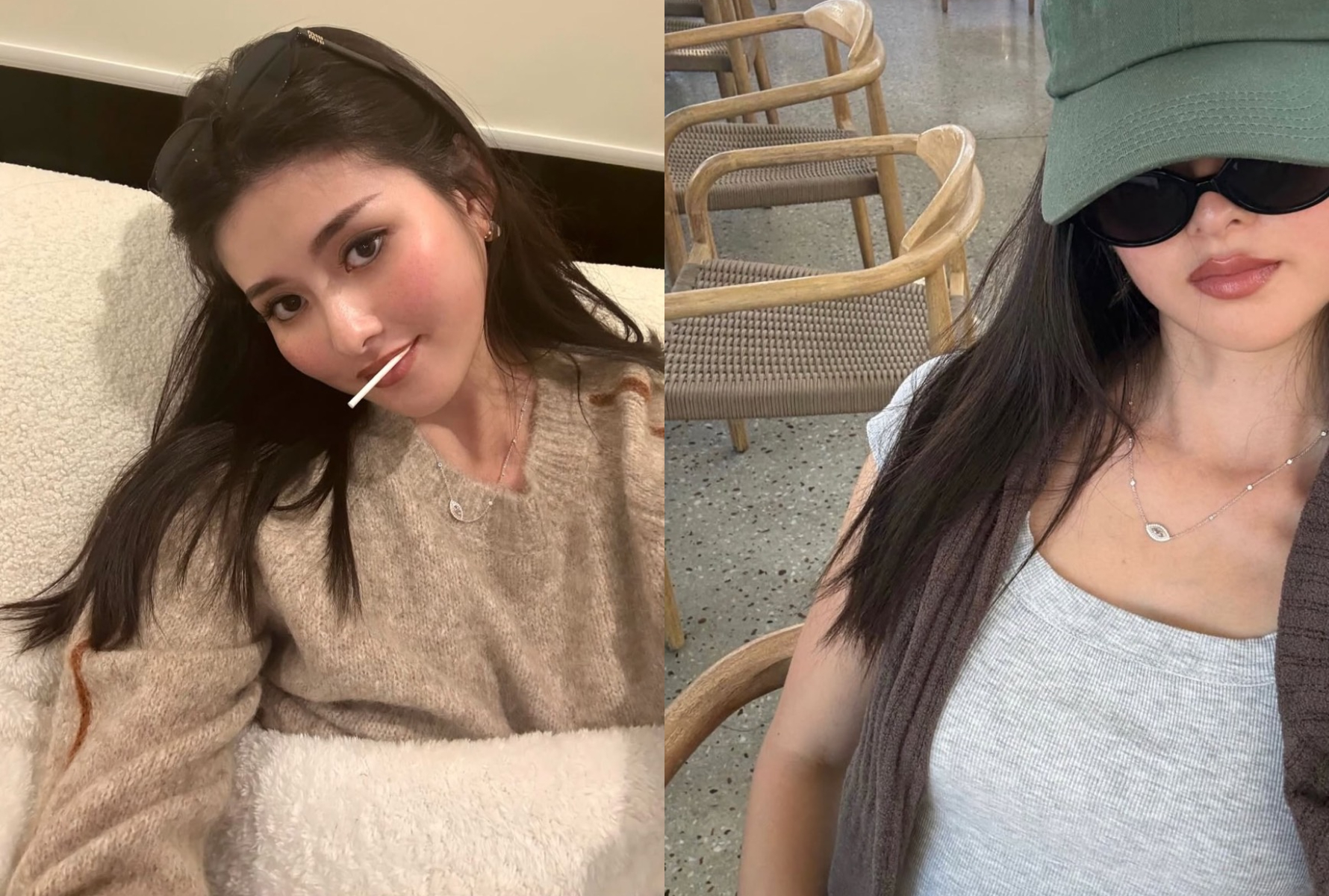 廖思惟近日在小紅書分享近照,只見她穿著米色針織上衣,妝容精緻,脖子上配戴了眼睛項鍊,嘴上叼著一根棒狀物,躺在沙發上,看上去相當愜意。