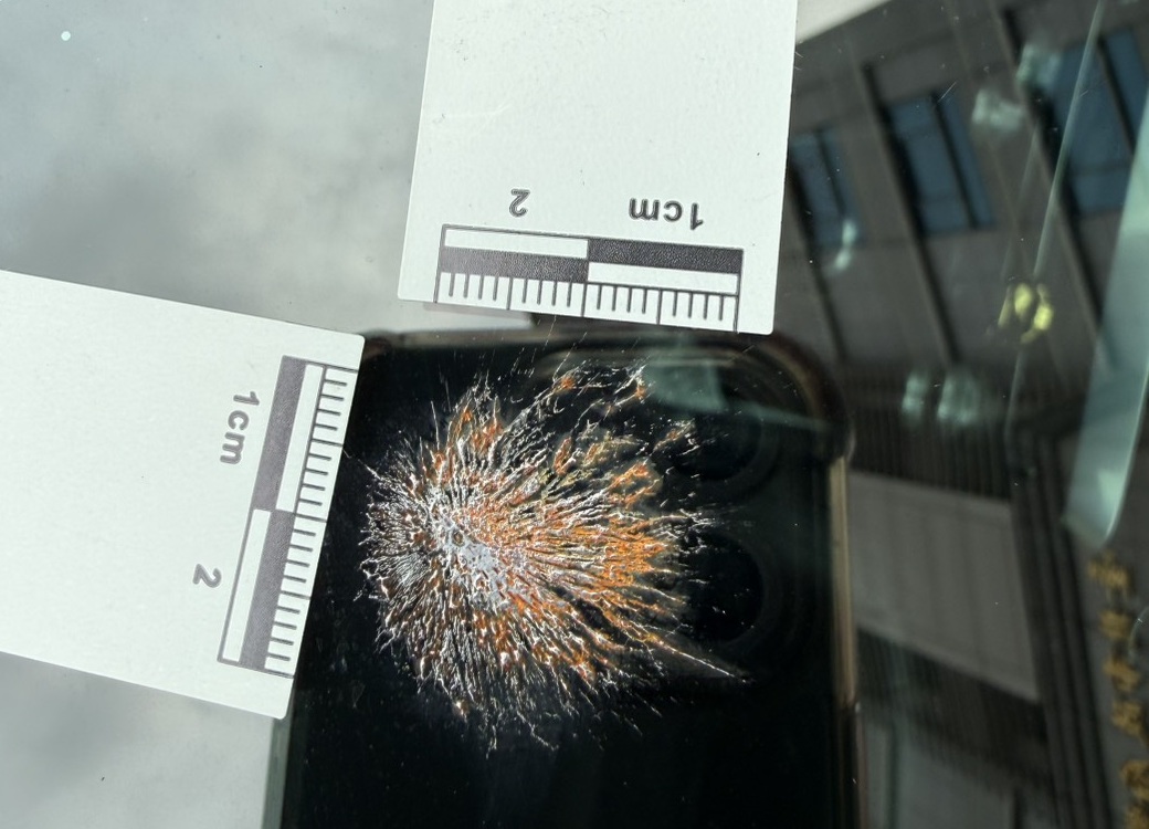 據了解,林姓女車主日前準備用車時,赫然發現前擋風玻璃出現不明白色放射狀痕跡,從外觀看中心位置呈現厚實結塊,外圍則有細碎的網狀紋路,像極了子彈或彈珠造成的擊穿。