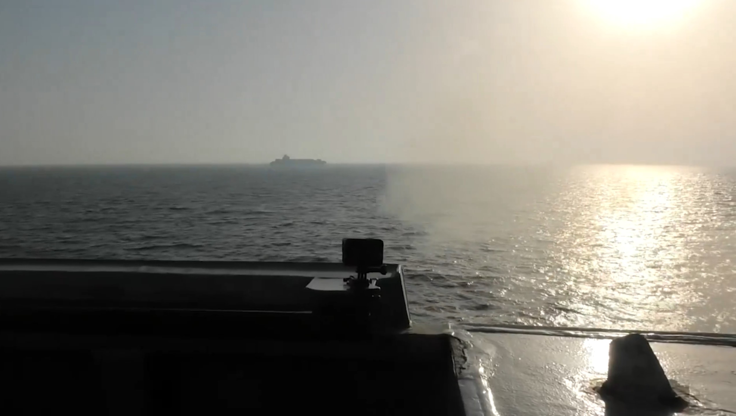 美國總統川普表示,一艘伊朗貨輪因不理會停船警告,遭美國海軍擊出一個洞,開火畫面也曝光了。